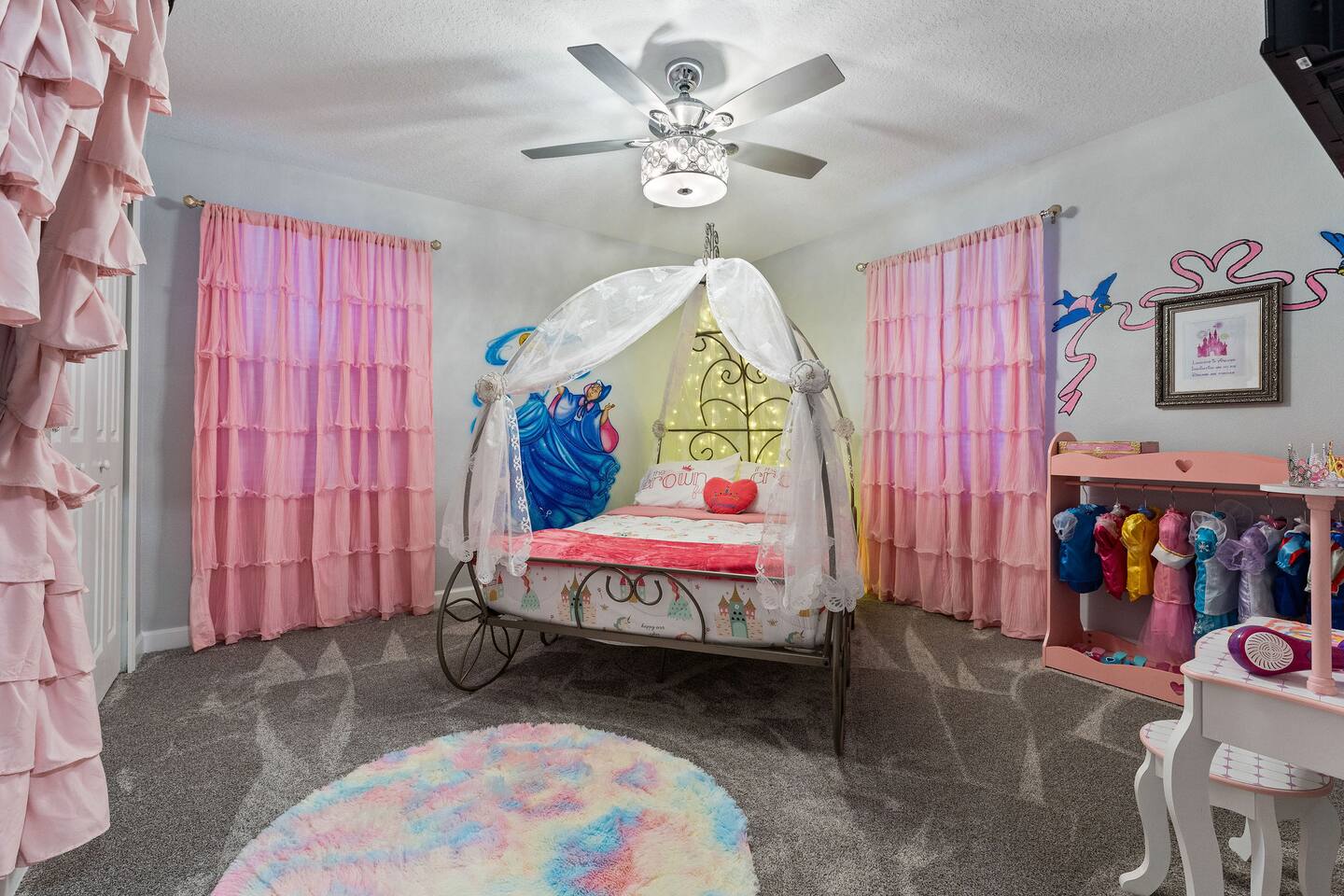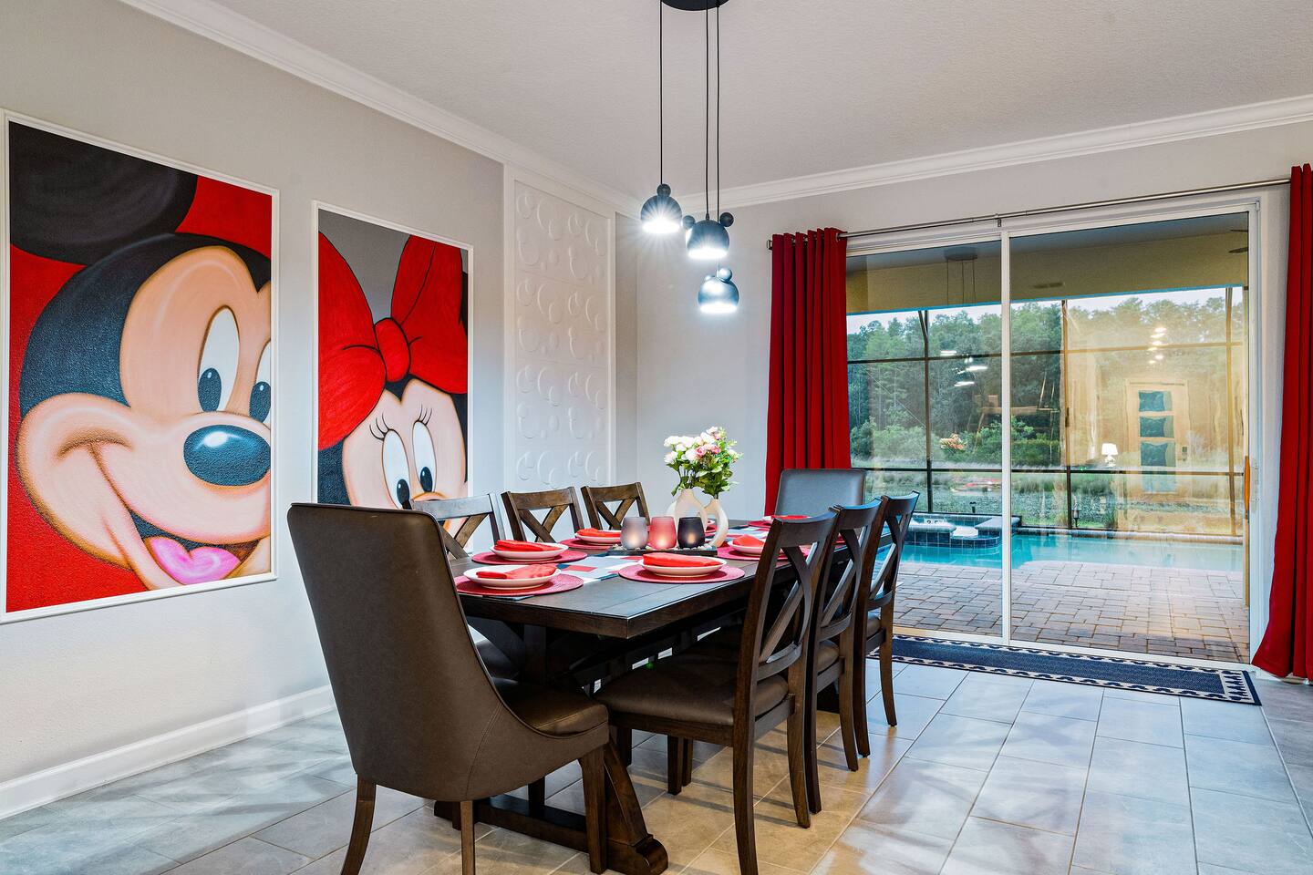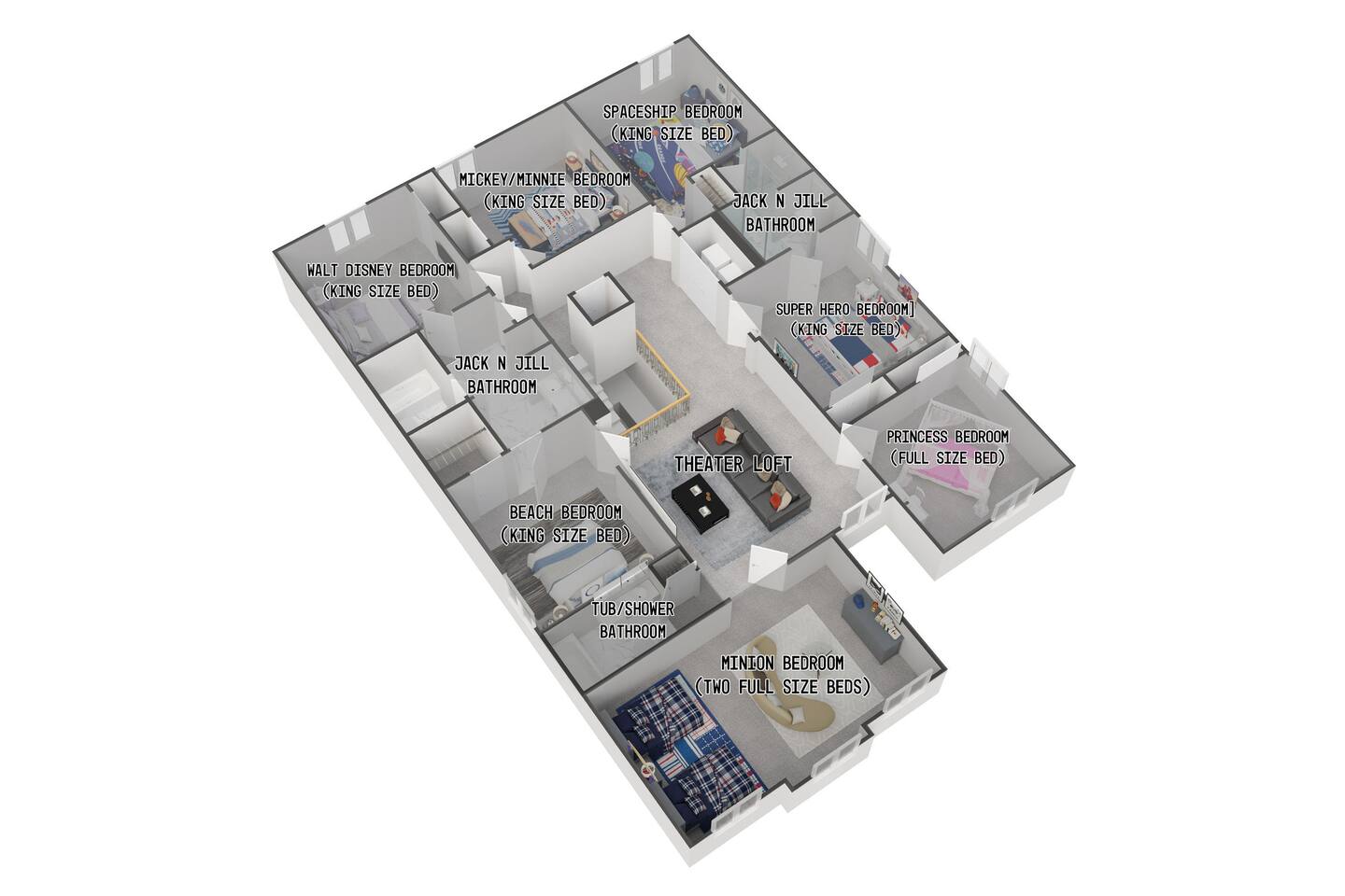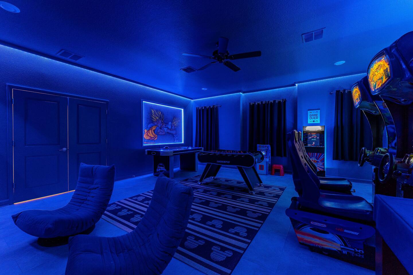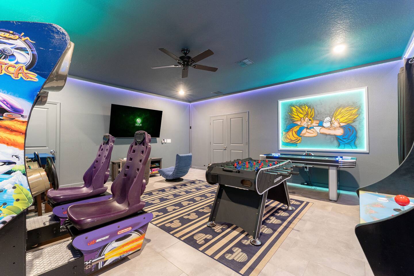 Miraculous Preserve Home: SIZE - 4300 sq ft - Parking on property NINE BEDROOMS - Bedroom 1: 50's/Mid Century Themed Master Bedroom on first floor with King bed, large screen smart tv and private full bathroom with garden tub and separate shower with outside entrance to patio/pool. - Bedroom 2: Western Themed on first floor with King bed, Smart TV, and entrance to full bathroom - Bedroom 3: Tribute to Walt Disney Themed with King bed, Smart TV, and entrance to Jack and Jill full bathroom. - Bedroom 4: Mickey/Minnie Themed with King bed and Smart TV - Bedroom 5: Spaceship Themed with King bed, Smart TV, and entrance to Jack and Jill full bathroom. - Bedroom 6: Superhero Themed with King bed, Smart TV, and entrance to Jack and Jill full bathroom. - Bedroom 7: Beach Themed with King bed, Smart TV and entrance to Jack and Jill full bathroom. - Bedroom 8: Princess Themed with full size carriage bed, vanity, and tent, and Smart TV. - Bedroom 9: Cartoon Themed with two full size beds, Xbox, gaming chairs, and Smart TV BATHROOMS - Bath 1: Full Private Master Bath on lower level with outside entrance to patio/pool - Bath 2: Full Bath on lower level with shower with entrance from Bedroom and hall - Bath 3: Full Jack & Jill Bath on second level with shower - Bath 4: Full Jack & Jill Bath on second level with shower - Bath 5: Full Bath with tub/shower combination LIVING ROOM/KITCHEN - Open concept living/kitchen and dining on lower level with Smart TV and snack bar - Fully equipped kitchen and coffee station GAME ROOM - Two Commercial Arcade Racing Games that can be linked together (play for free) - PacMan Arcade Game - Galaga Arcade Game - Pet Patrol Arcade Game - 75 Inch Smart TV - X Box Series S - Foosball - Air Hockey Table - Game Table - Board Games MOVIE/LOFT AREA - Large screen Smart TV - Theater Reclining Seating OTHER INFO - High Speed Internet - Spectrum Cable OUTSIDE - South Facing Pool backing up to protected Preservation land - Outside Grill with grilling utensils - Private Screened in Pool and Hot Tub with child safety gate - Patio with dining and conversation area with ceiling fans STOREY LAKE COMMUNITY ACCESS - Resort style Pool - Lazy River - Water Park - Spa - Exercise Gym - Basketball, Volleyball, Tennis Courts DISTANCE TO OTHER ATTRACTIONS: - About 6 miles from Disney Entrance without having to get on the busy expressway. - About 13 miles to Universal - About 9 miles from SeaWorld.