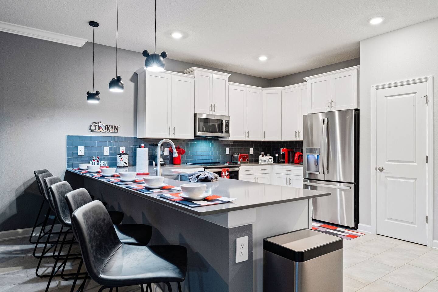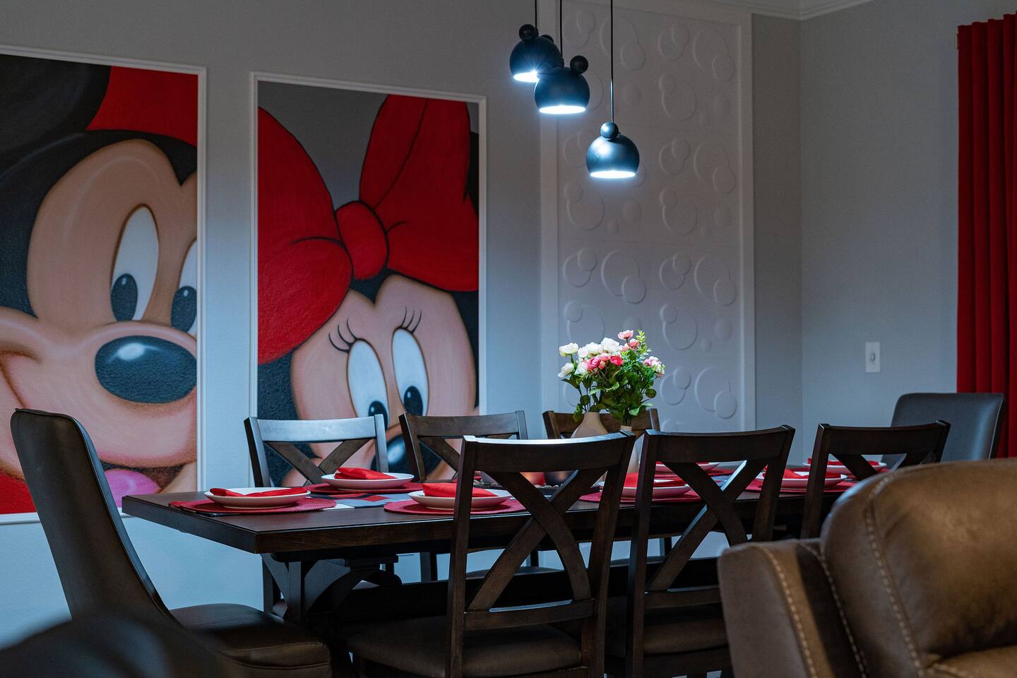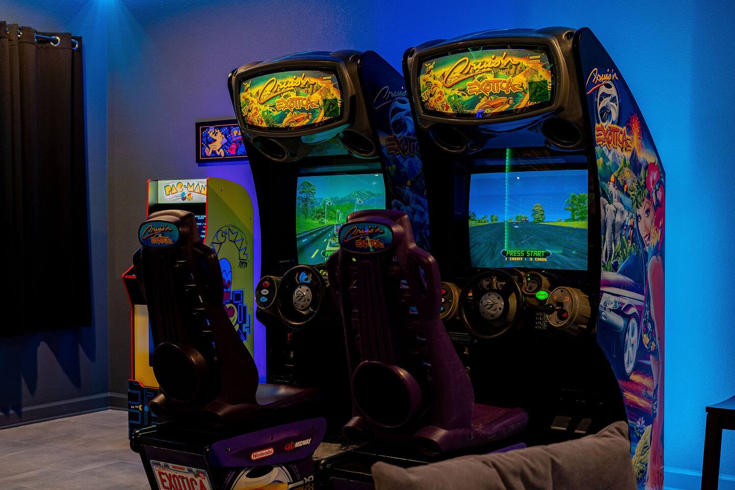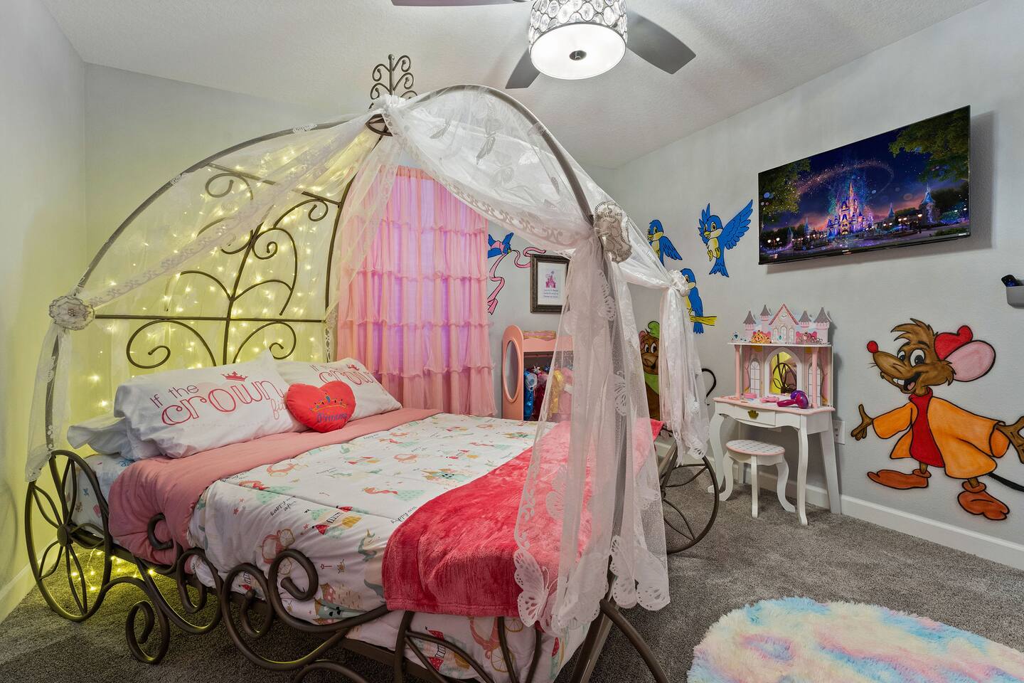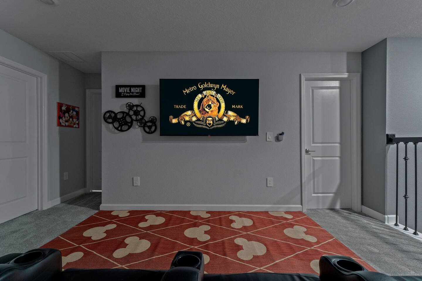 Miraculous Preserve Home: SIZE - 4300 sq ft - Parking on property NINE BEDROOMS - Bedroom 1: 50's/Mid Century Themed Master Bedroom on first floor with King bed, large screen smart tv and private full bathroom with garden tub and separate shower with outside entrance to patio/pool. - Bedroom 2: Western Themed on first floor with King bed, Smart TV, and entrance to full bathroom - Bedroom 3: Tribute to Walt Disney Themed with King bed, Smart TV, and entrance to Jack and Jill full bathroom. - Bedroom 4: Mickey/Minnie Themed with King bed and Smart TV - Bedroom 5: Spaceship Themed with King bed, Smart TV, and entrance to Jack and Jill full bathroom. - Bedroom 6: Superhero Themed with King bed, Smart TV, and entrance to Jack and Jill full bathroom. - Bedroom 7: Beach Themed with King bed, Smart TV and entrance to Jack and Jill full bathroom. - Bedroom 8: Princess Themed with full size carriage bed, vanity, and tent, and Smart TV. - Bedroom 9: Cartoon Themed with two full size beds, Xbox, gaming chairs, and Smart TV BATHROOMS - Bath 1: Full Private Master Bath on lower level with outside entrance to patio/pool - Bath 2: Full Bath on lower level with shower with entrance from Bedroom and hall - Bath 3: Full Jack & Jill Bath on second level with shower - Bath 4: Full Jack & Jill Bath on second level with shower - Bath 5: Full Bath with tub/shower combination LIVING ROOM/KITCHEN - Open concept living/kitchen and dining on lower level with Smart TV and snack bar - Fully equipped kitchen and coffee station GAME ROOM - Two Commercial Arcade Racing Games that can be linked together (play for free) - PacMan Arcade Game - Galaga Arcade Game - Pet Patrol Arcade Game - 75 Inch Smart TV - X Box Series S - Foosball - Air Hockey Table - Game Table - Board Games MOVIE/LOFT AREA - Large screen Smart TV - Theater Reclining Seating OTHER INFO - High Speed Internet - Spectrum Cable OUTSIDE - South Facing Pool backing up to protected Preservation land - Outside Grill with grilling utensils - Private Screened in Pool and Hot Tub with child safety gate - Patio with dining and conversation area with ceiling fans STOREY LAKE COMMUNITY ACCESS - Resort style Pool - Lazy River - Water Park - Spa - Exercise Gym - Basketball, Volleyball, Tennis Courts DISTANCE TO OTHER ATTRACTIONS: - About 6 miles from Disney Entrance without having to get on the busy expressway. - About 13 miles to Universal - About 9 miles from SeaWorld.