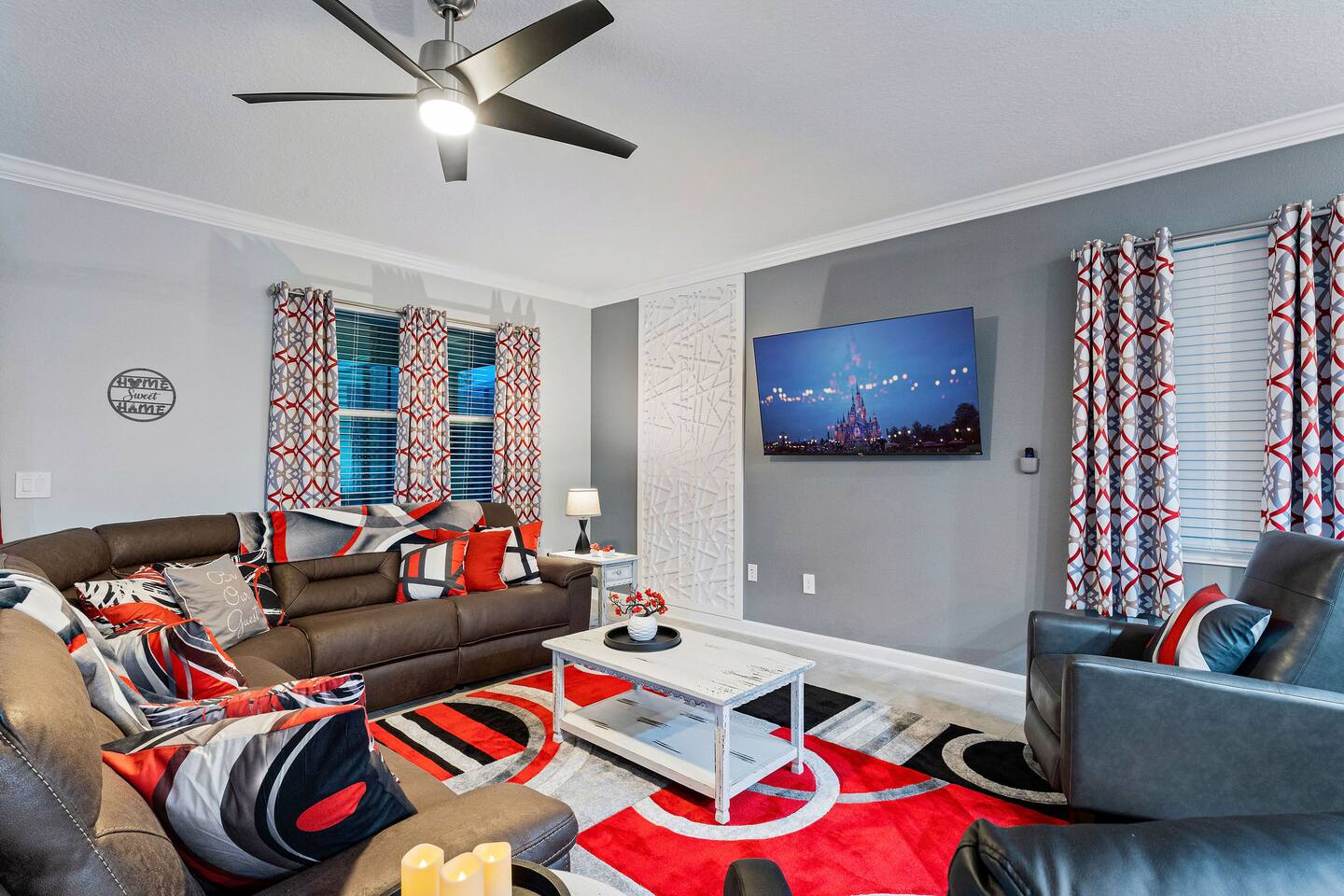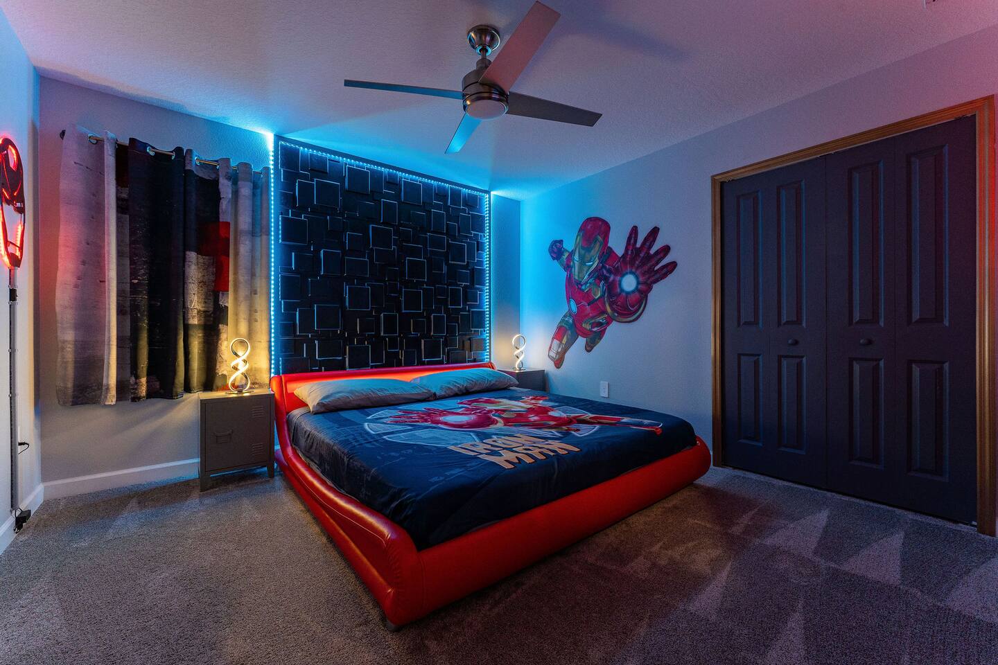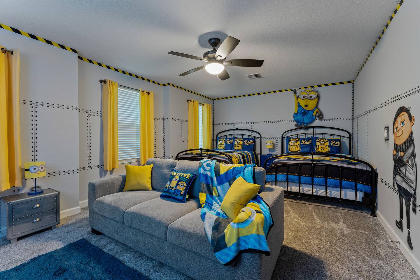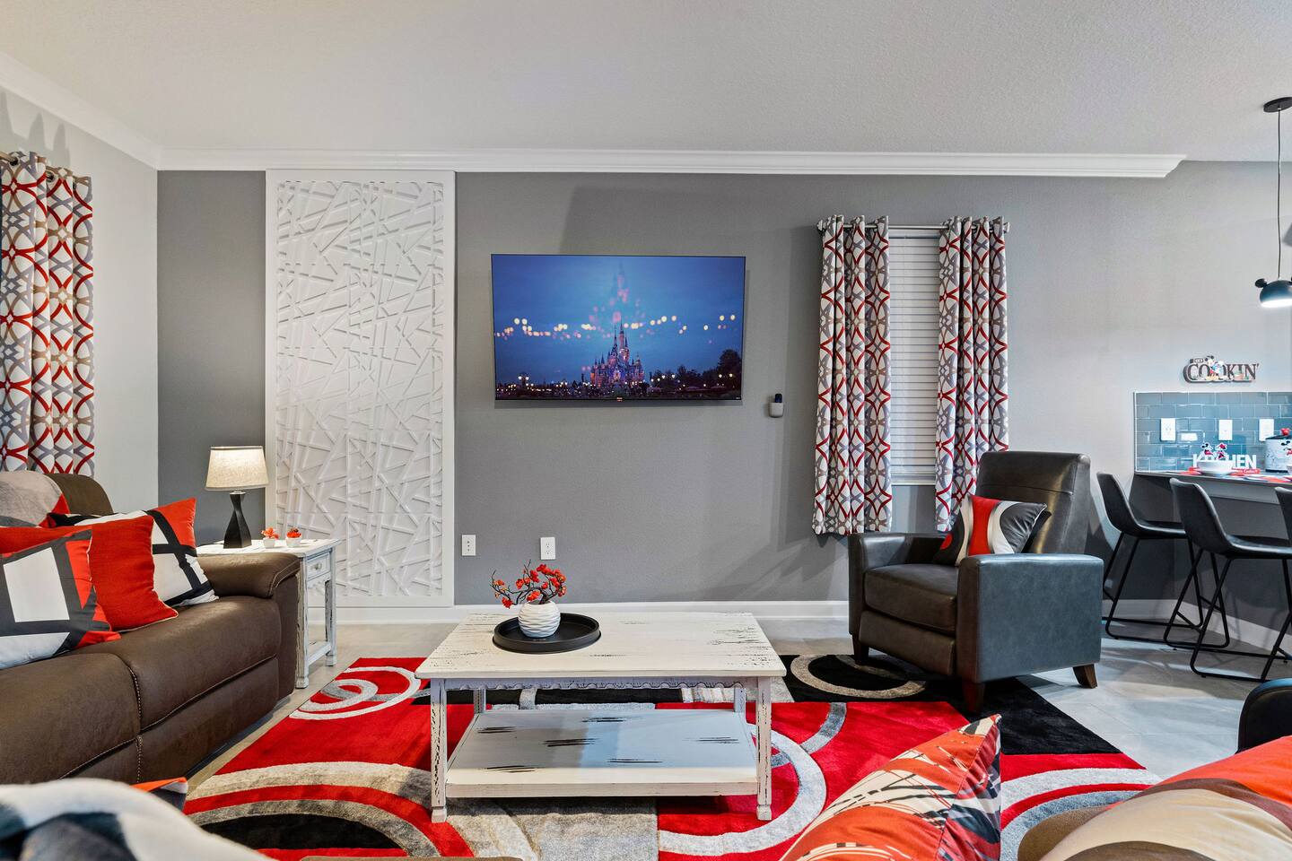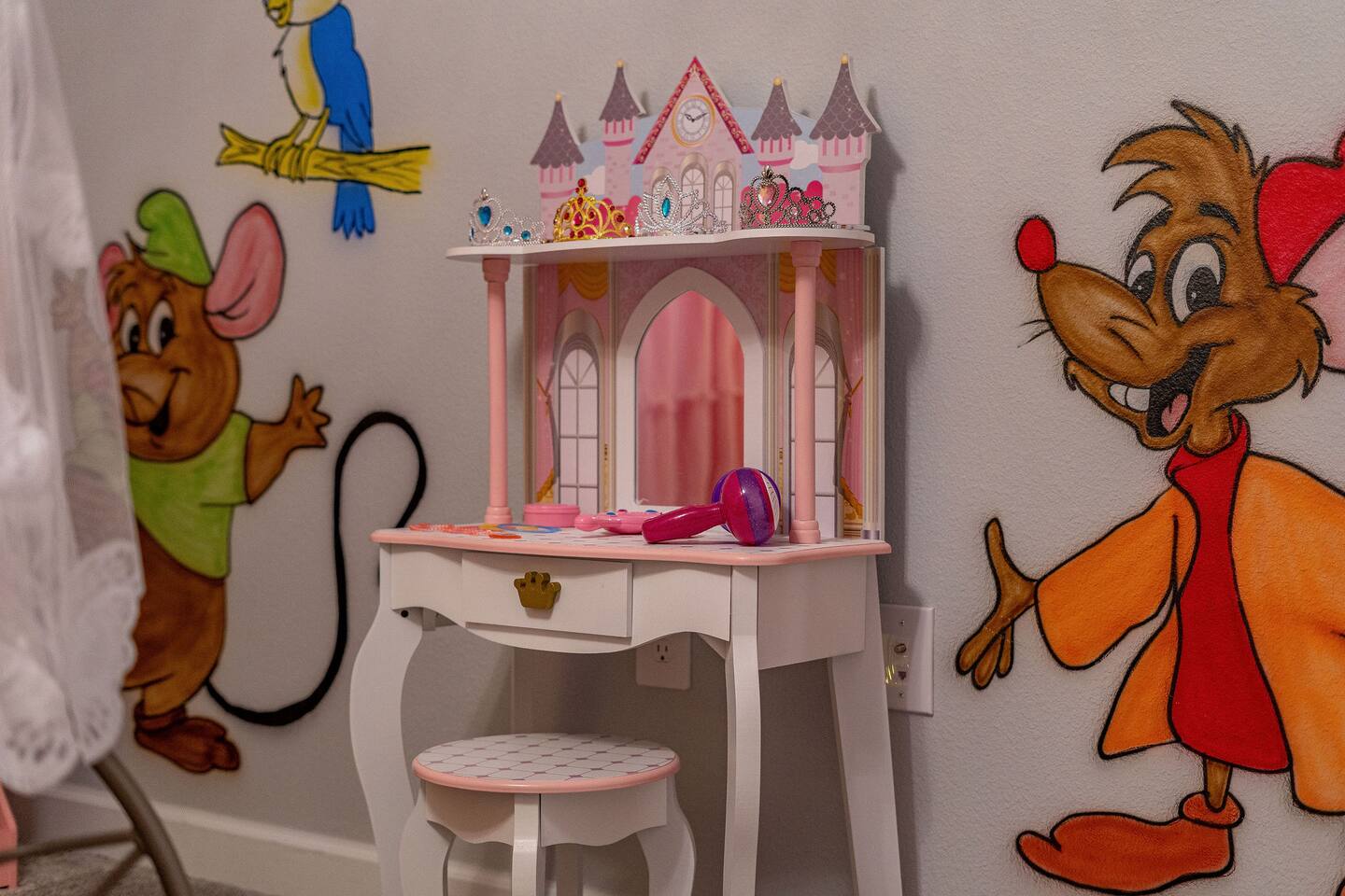 Miraculous Preserve Home: SIZE - 4300 sq ft - Parking on property NINE BEDROOMS - Bedroom 1: 50's/Mid Century Themed Master Bedroom on first floor with King bed, large screen smart tv and private full bathroom with garden tub and separate shower with outside entrance to patio/pool. - Bedroom 2: Western Themed on first floor with King bed, Smart TV, and entrance to full bathroom - Bedroom 3: Tribute to Walt Disney Themed with King bed, Smart TV, and entrance to Jack and Jill full bathroom. - Bedroom 4: Mickey/Minnie Themed with King bed and Smart TV - Bedroom 5: Spaceship Themed with King bed, Smart TV, and entrance to Jack and Jill full bathroom. - Bedroom 6: Superhero Themed with King bed, Smart TV, and entrance to Jack and Jill full bathroom. - Bedroom 7: Beach Themed with King bed, Smart TV and entrance to Jack and Jill full bathroom. - Bedroom 8: Princess Themed with full size carriage bed, vanity, and tent, and Smart TV. - Bedroom 9: Cartoon Themed with two full size beds, Xbox, gaming chairs, and Smart TV BATHROOMS - Bath 1: Full Private Master Bath on lower level with outside entrance to patio/pool - Bath 2: Full Bath on lower level with shower with entrance from Bedroom and hall - Bath 3: Full Jack & Jill Bath on second level with shower - Bath 4: Full Jack & Jill Bath on second level with shower - Bath 5: Full Bath with tub/shower combination LIVING ROOM/KITCHEN - Open concept living/kitchen and dining on lower level with Smart TV and snack bar - Fully equipped kitchen and coffee station GAME ROOM - Two Commercial Arcade Racing Games that can be linked together (play for free) - PacMan Arcade Game - Galaga Arcade Game - Pet Patrol Arcade Game - 75 Inch Smart TV - X Box Series S - Foosball - Air Hockey Table - Game Table - Board Games MOVIE/LOFT AREA - Large screen Smart TV - Theater Reclining Seating OTHER INFO - High Speed Internet - Spectrum Cable OUTSIDE - South Facing Pool backing up to protected Preservation land - Outside Grill with grilling utensils - Private Screened in Pool and Hot Tub with child safety gate - Patio with dining and conversation area with ceiling fans STOREY LAKE COMMUNITY ACCESS - Resort style Pool - Lazy River - Water Park - Spa - Exercise Gym - Basketball, Volleyball, Tennis Courts DISTANCE TO OTHER ATTRACTIONS: - About 6 miles from Disney Entrance without having to get on the busy expressway. - About 13 miles to Universal - About 9 miles from SeaWorld.