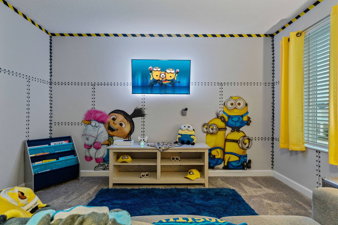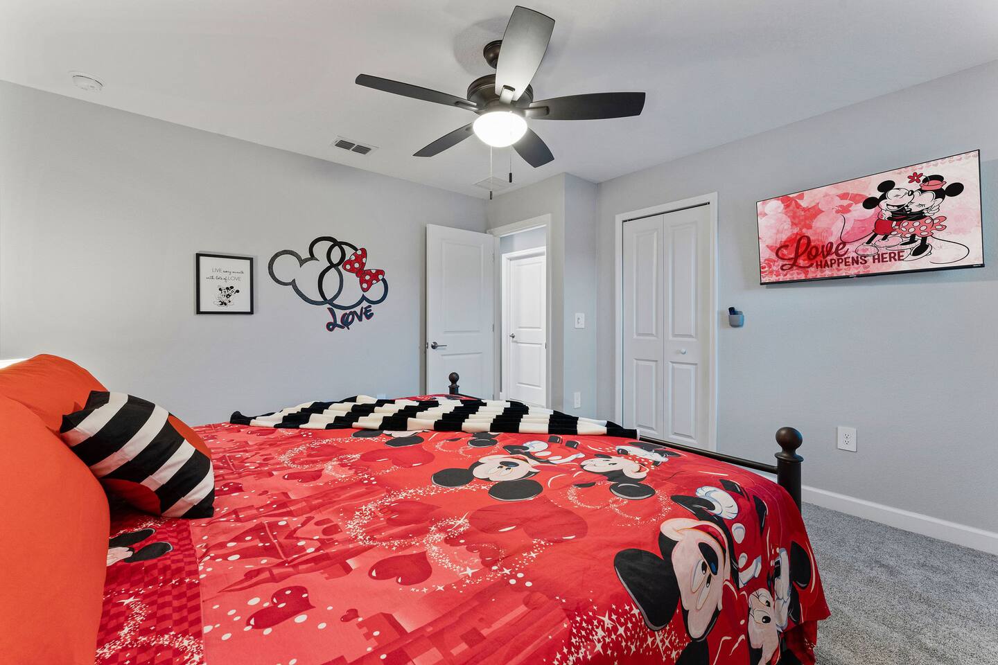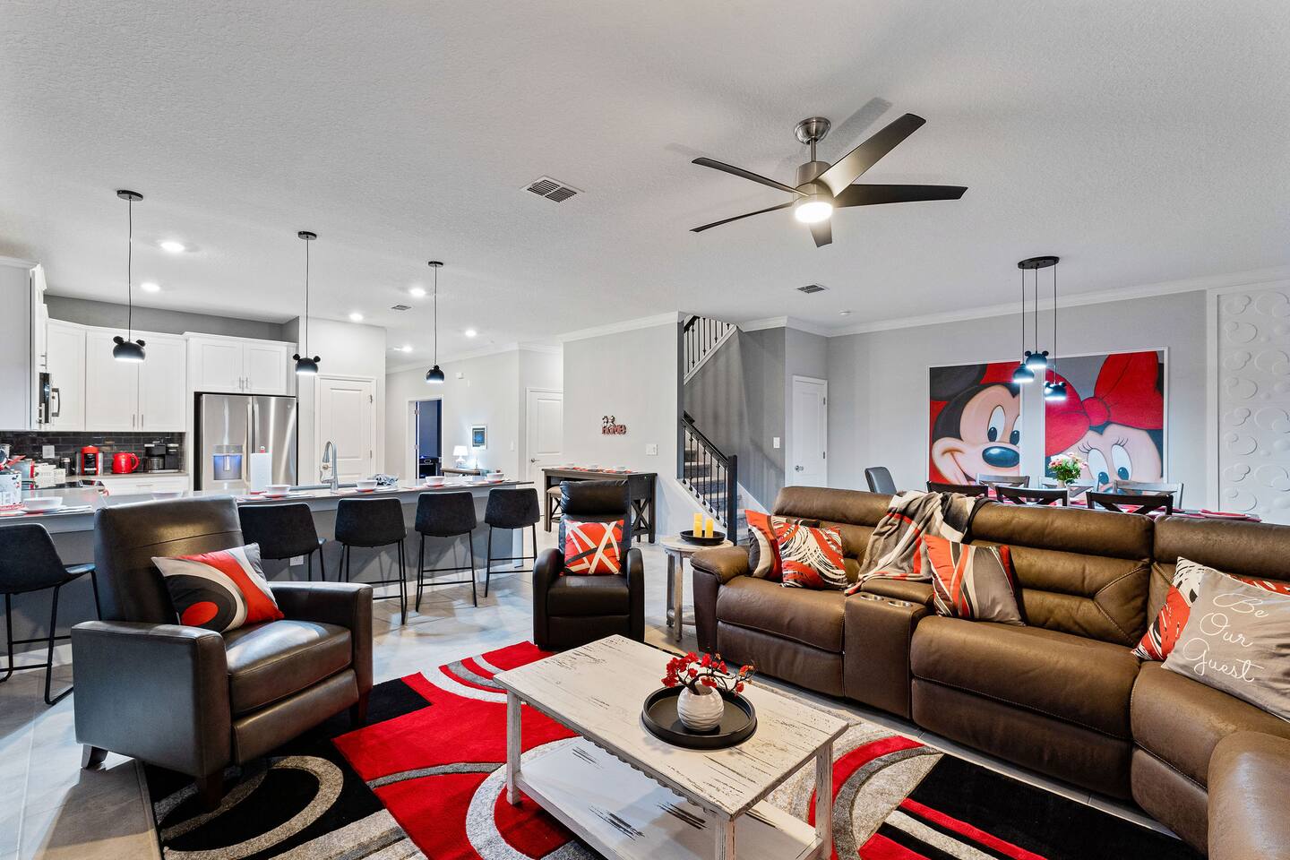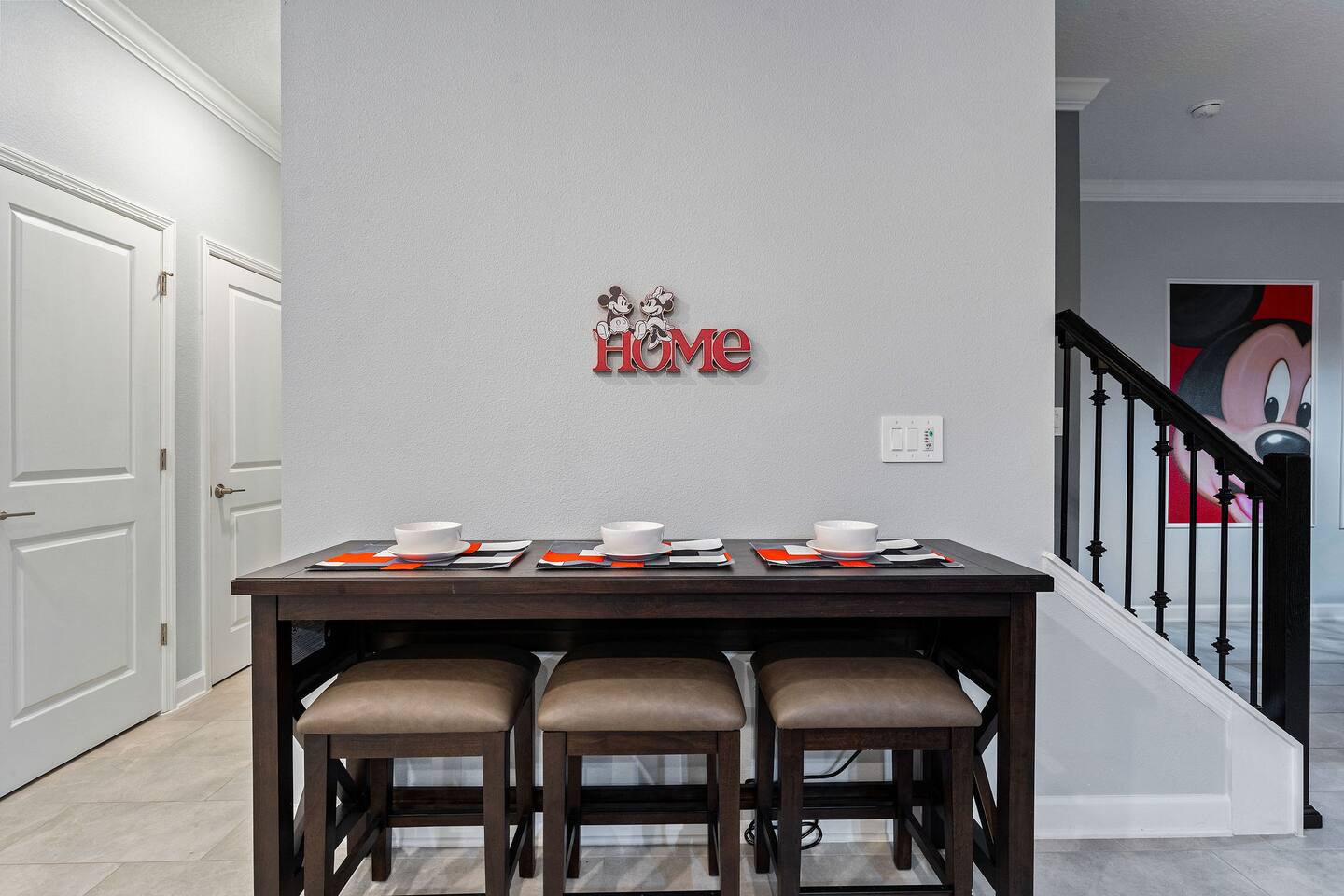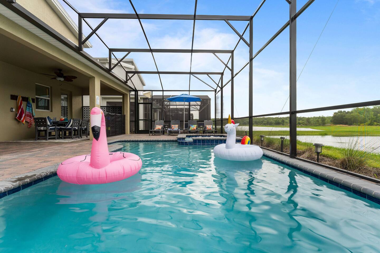 Miraculous Preserve Home: SIZE - 4300 sq ft - Parking on property NINE BEDROOMS - Bedroom 1: 50's/Mid Century Themed Master Bedroom on first floor with King bed, large screen smart tv and private full bathroom with garden tub and separate shower with outside entrance to patio/pool. - Bedroom 2: Western Themed on first floor with King bed, Smart TV, and entrance to full bathroom - Bedroom 3: Tribute to Walt Disney Themed with King bed, Smart TV, and entrance to Jack and Jill full bathroom. - Bedroom 4: Mickey/Minnie Themed with King bed and Smart TV - Bedroom 5: Spaceship Themed with King bed, Smart TV, and entrance to Jack and Jill full bathroom. - Bedroom 6: Superhero Themed with King bed, Smart TV, and entrance to Jack and Jill full bathroom. - Bedroom 7: Beach Themed with King bed, Smart TV and entrance to Jack and Jill full bathroom. - Bedroom 8: Princess Themed with full size carriage bed, vanity, and tent, and Smart TV. - Bedroom 9: Cartoon Themed with two full size beds, Xbox, gaming chairs, and Smart TV BATHROOMS - Bath 1: Full Private Master Bath on lower level with outside entrance to patio/pool - Bath 2: Full Bath on lower level with shower with entrance from Bedroom and hall - Bath 3: Full Jack & Jill Bath on second level with shower - Bath 4: Full Jack & Jill Bath on second level with shower - Bath 5: Full Bath with tub/shower combination LIVING ROOM/KITCHEN - Open concept living/kitchen and dining on lower level with Smart TV and snack bar - Fully equipped kitchen and coffee station GAME ROOM - Two Commercial Arcade Racing Games that can be linked together (play for free) - PacMan Arcade Game - Galaga Arcade Game - Pet Patrol Arcade Game - 75 Inch Smart TV - X Box Series S - Foosball - Air Hockey Table - Game Table - Board Games MOVIE/LOFT AREA - Large screen Smart TV - Theater Reclining Seating OTHER INFO - High Speed Internet - Spectrum Cable OUTSIDE - South Facing Pool backing up to protected Preservation land - Outside Grill with grilling utensils - Private Screened in Pool and Hot Tub with child safety gate - Patio with dining and conversation area with ceiling fans STOREY LAKE COMMUNITY ACCESS - Resort style Pool - Lazy River - Water Park - Spa - Exercise Gym - Basketball, Volleyball, Tennis Courts DISTANCE TO OTHER ATTRACTIONS: - About 6 miles from Disney Entrance without having to get on the busy expressway. - About 13 miles to Universal - About 9 miles from SeaWorld.