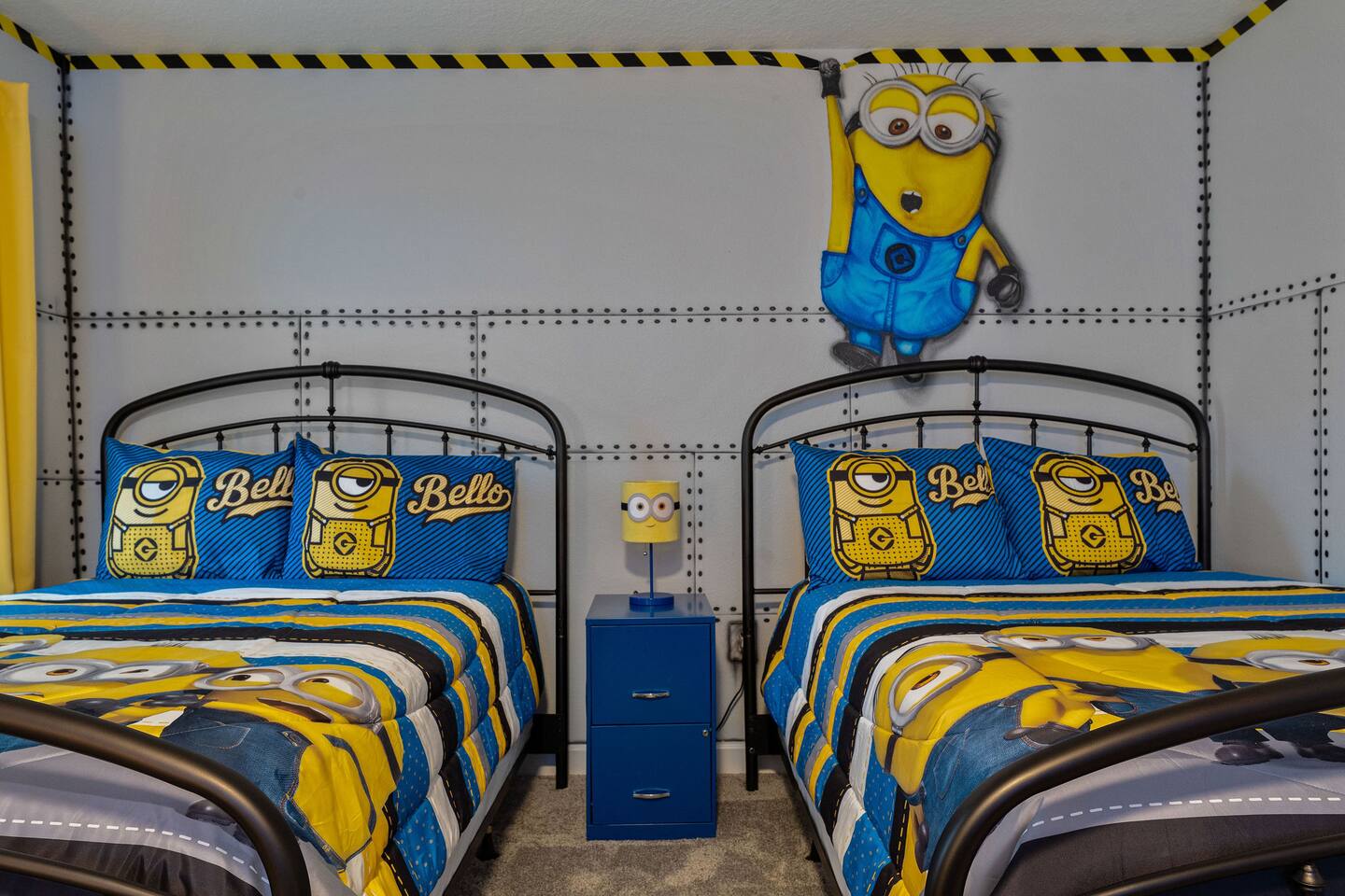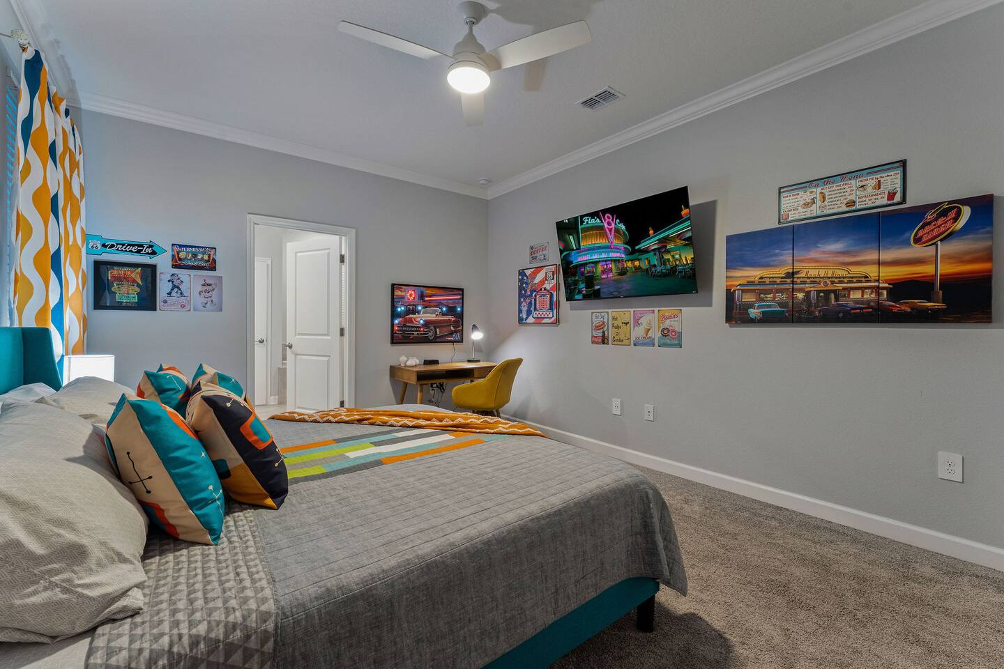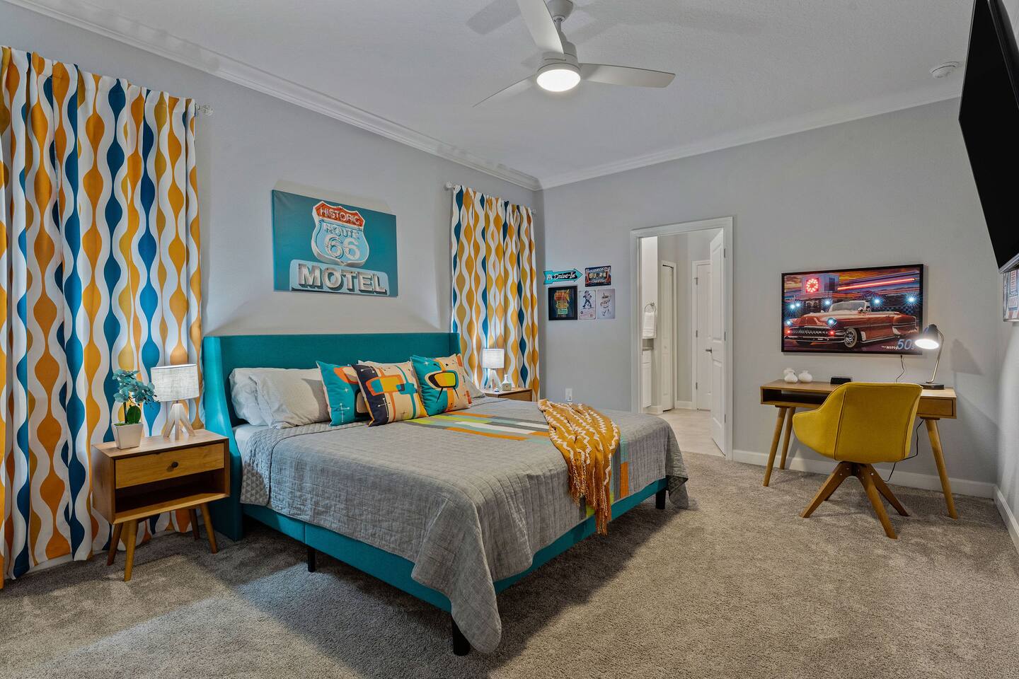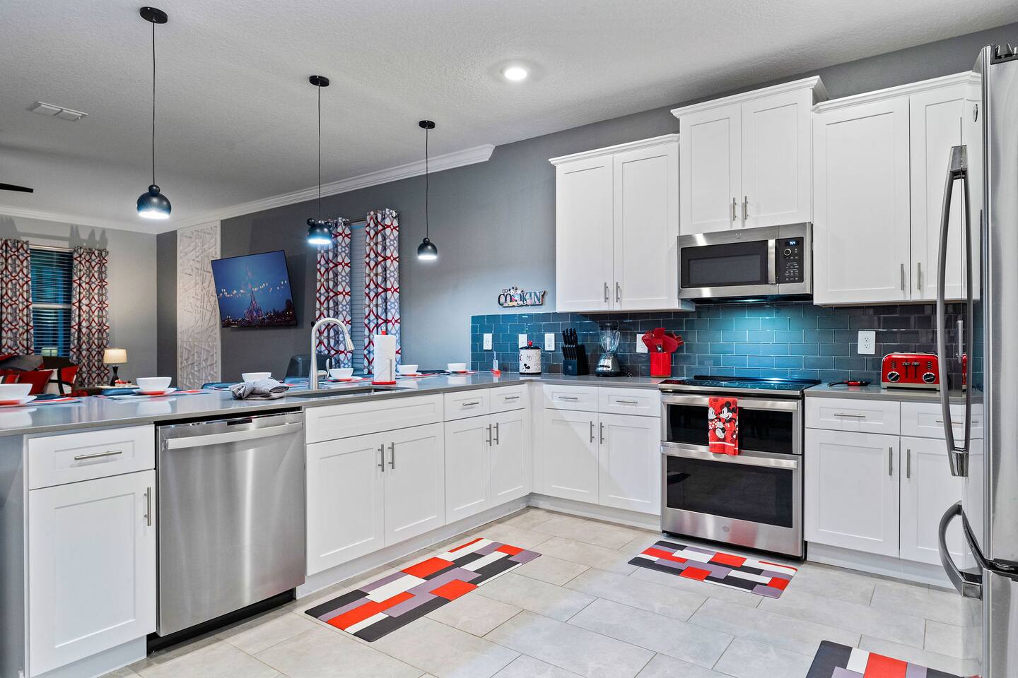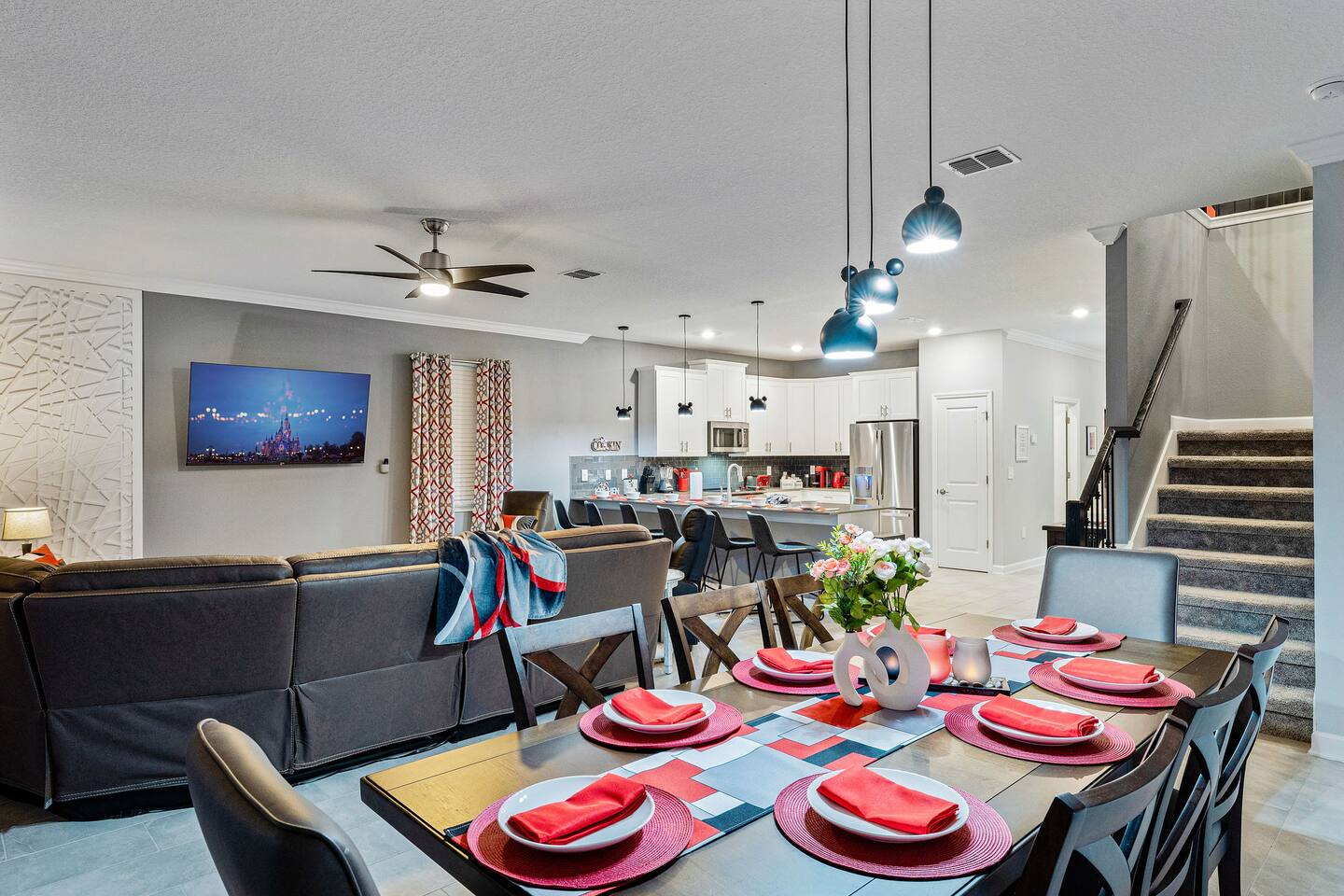 Miraculous Preserve Home: SIZE - 4300 sq ft - Parking on property NINE BEDROOMS - Bedroom 1: 50's/Mid Century Themed Master Bedroom on first floor with King bed, large screen smart tv and private full bathroom with garden tub and separate shower with outside entrance to patio/pool. - Bedroom 2: Western Themed on first floor with King bed, Smart TV, and entrance to full bathroom - Bedroom 3: Tribute to Walt Disney Themed with King bed, Smart TV, and entrance to Jack and Jill full bathroom. - Bedroom 4: Mickey/Minnie Themed with King bed and Smart TV - Bedroom 5: Spaceship Themed with King bed, Smart TV, and entrance to Jack and Jill full bathroom. - Bedroom 6: Superhero Themed with King bed, Smart TV, and entrance to Jack and Jill full bathroom. - Bedroom 7: Beach Themed with King bed, Smart TV and entrance to Jack and Jill full bathroom. - Bedroom 8: Princess Themed with full size carriage bed, vanity, and tent, and Smart TV. - Bedroom 9: Cartoon Themed with two full size beds, Xbox, gaming chairs, and Smart TV BATHROOMS - Bath 1: Full Private Master Bath on lower level with outside entrance to patio/pool - Bath 2: Full Bath on lower level with shower with entrance from Bedroom and hall - Bath 3: Full Jack & Jill Bath on second level with shower - Bath 4: Full Jack & Jill Bath on second level with shower - Bath 5: Full Bath with tub/shower combination LIVING ROOM/KITCHEN - Open concept living/kitchen and dining on lower level with Smart TV and snack bar - Fully equipped kitchen and coffee station GAME ROOM - Two Commercial Arcade Racing Games that can be linked together (play for free) - PacMan Arcade Game - Galaga Arcade Game - Pet Patrol Arcade Game - 75 Inch Smart TV - X Box Series S - Foosball - Air Hockey Table - Game Table - Board Games MOVIE/LOFT AREA - Large screen Smart TV - Theater Reclining Seating OTHER INFO - High Speed Internet - Spectrum Cable OUTSIDE - South Facing Pool backing up to protected Preservation land - Outside Grill with grilling utensils - Private Screened in Pool and Hot Tub with child safety gate - Patio with dining and conversation area with ceiling fans STOREY LAKE COMMUNITY ACCESS - Resort style Pool - Lazy River - Water Park - Spa - Exercise Gym - Basketball, Volleyball, Tennis Courts DISTANCE TO OTHER ATTRACTIONS: - About 6 miles from Disney Entrance without having to get on the busy expressway. - About 13 miles to Universal - About 9 miles from SeaWorld.