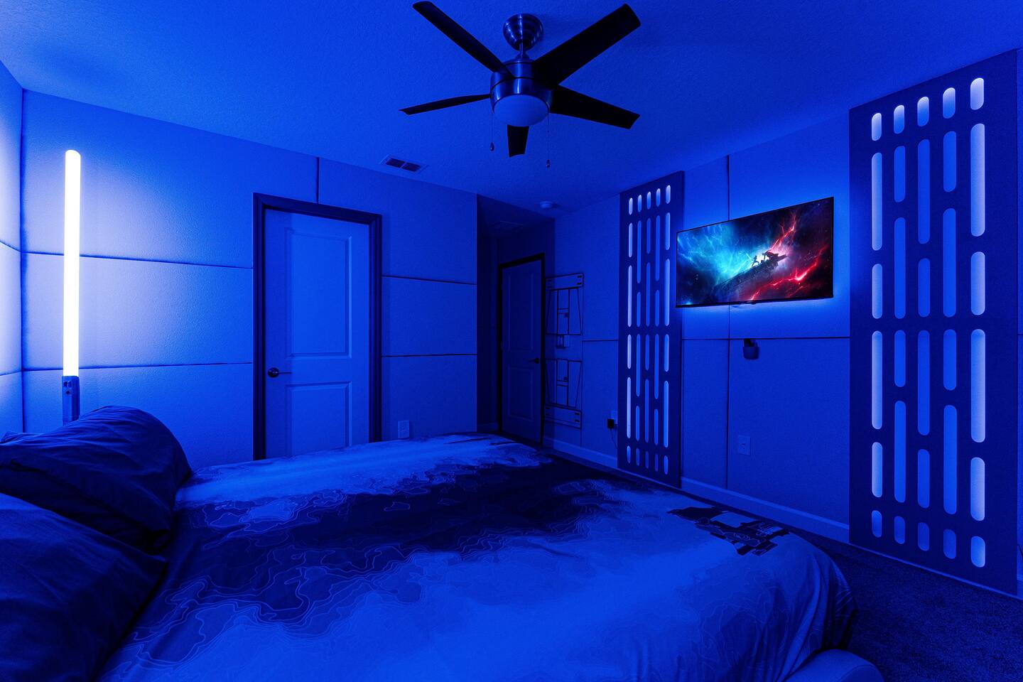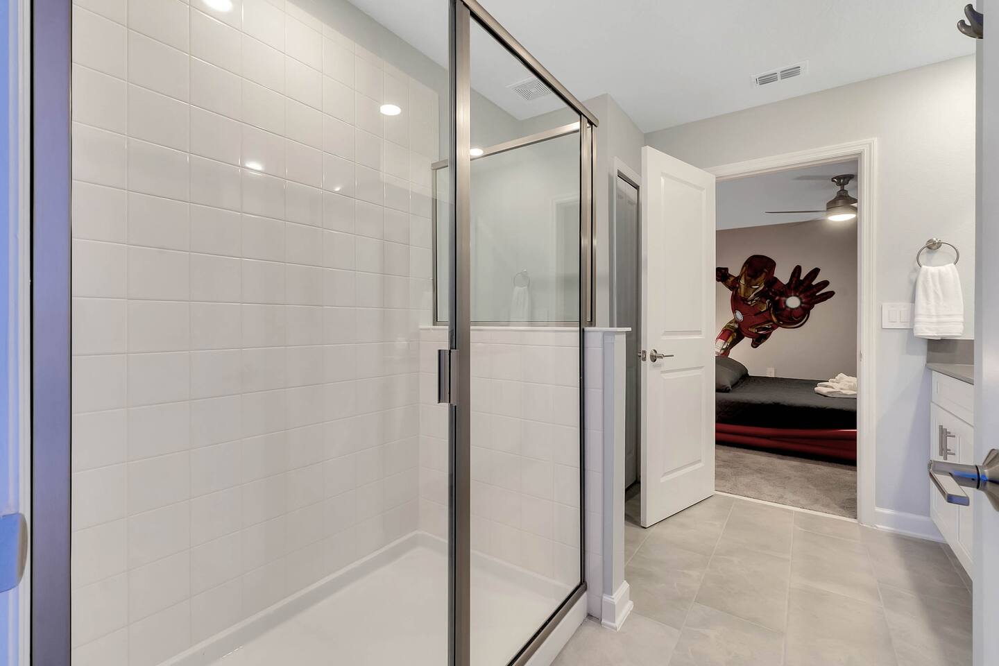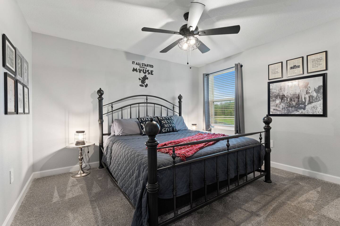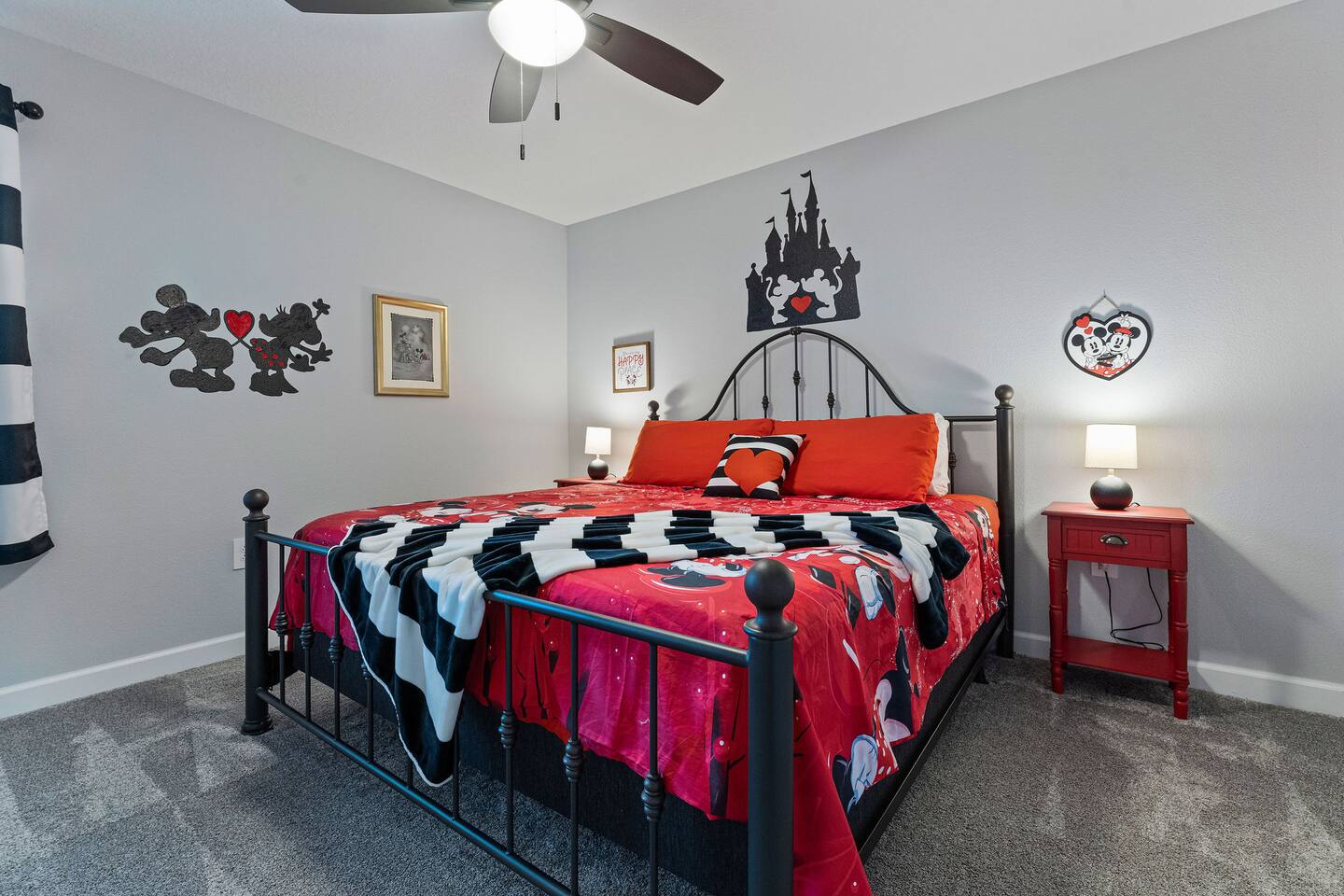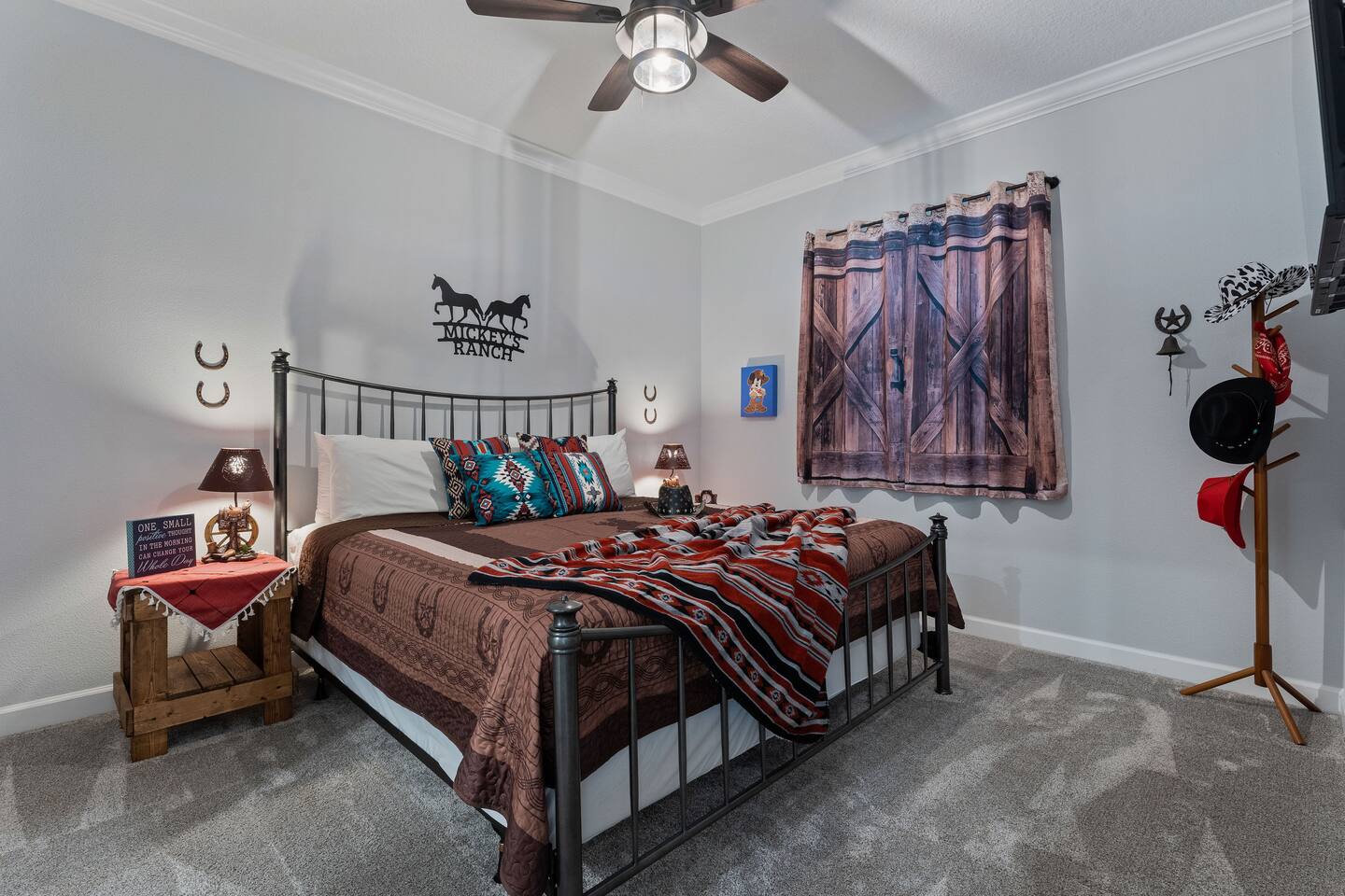Miraculous Preserve Home: SIZE - 4300 sq ft - Parking on property NINE BEDROOMS - Bedroom 1: 50's/Mid Century Themed Master Bedroom on first floor with King bed, large screen smart tv and private full bathroom with garden tub and separate shower with outside entrance to patio/pool. - Bedroom 2: Western Themed on first floor with King bed, Smart TV, and entrance to full bathroom - Bedroom 3: Tribute to Walt Disney Themed with King bed, Smart TV, and entrance to Jack and Jill full bathroom. - Bedroom 4: Mickey/Minnie Themed with King bed and Smart TV - Bedroom 5: Spaceship Themed with King bed, Smart TV, and entrance to Jack and Jill full bathroom. - Bedroom 6: Superhero Themed with King bed, Smart TV, and entrance to Jack and Jill full bathroom. - Bedroom 7: Beach Themed with King bed, Smart TV and entrance to Jack and Jill full bathroom. - Bedroom 8: Princess Themed with full size carriage bed, vanity, and tent, and Smart TV. - Bedroom 9: Cartoon Themed with two full size beds, Xbox, gaming chairs, and Smart TV BATHROOMS - Bath 1: Full Private Master Bath on lower level with outside entrance to patio/pool - Bath 2: Full Bath on lower level with shower with entrance from Bedroom and hall - Bath 3: Full Jack & Jill Bath on second level with shower - Bath 4: Full Jack & Jill Bath on second level with shower - Bath 5: Full Bath with tub/shower combination LIVING ROOM/KITCHEN - Open concept living/kitchen and dining on lower level with Smart TV and snack bar - Fully equipped kitchen and coffee station GAME ROOM - Two Commercial Arcade Racing Games that can be linked together (play for free) - PacMan Arcade Game - Galaga Arcade Game - Pet Patrol Arcade Game - 75 Inch Smart TV - X Box Series S - Foosball - Air Hockey Table - Game Table - Board Games MOVIE/LOFT AREA - Large screen Smart TV - Theater Reclining Seating OTHER INFO - High Speed Internet - Spectrum Cable OUTSIDE - South Facing Pool backing up to protected Preservation land - Outside Grill with grilling utensils - Private Screened in Pool and Hot Tub with child safety gate - Patio with dining and conversation area with ceiling fans STOREY LAKE COMMUNITY ACCESS - Resort style Pool - Lazy River - Water Park - Spa - Exercise Gym - Basketball, Volleyball, Tennis Courts DISTANCE TO OTHER ATTRACTIONS: - About 6 miles from Disney Entrance without having to get on the busy expressway. - About 13 miles to Universal - About 9 miles from SeaWorld.