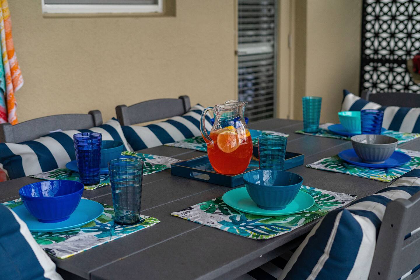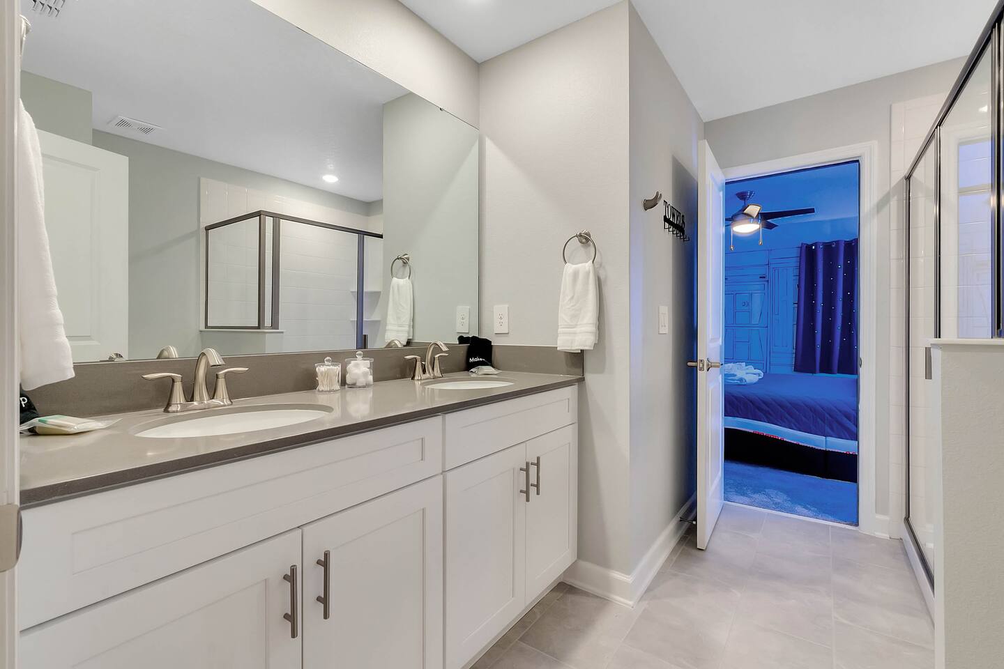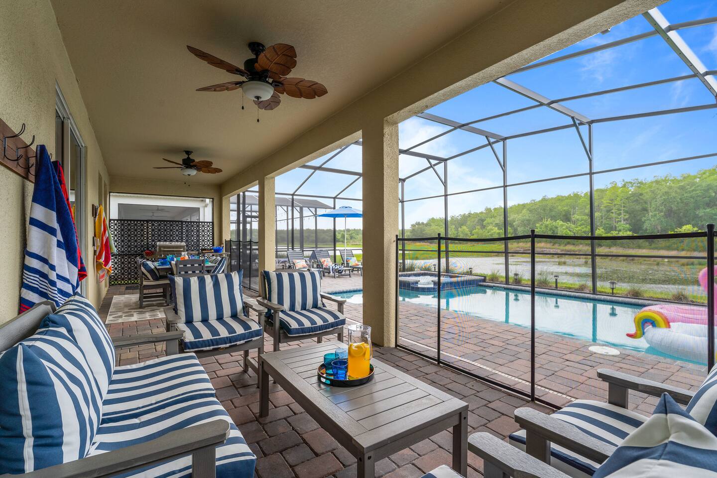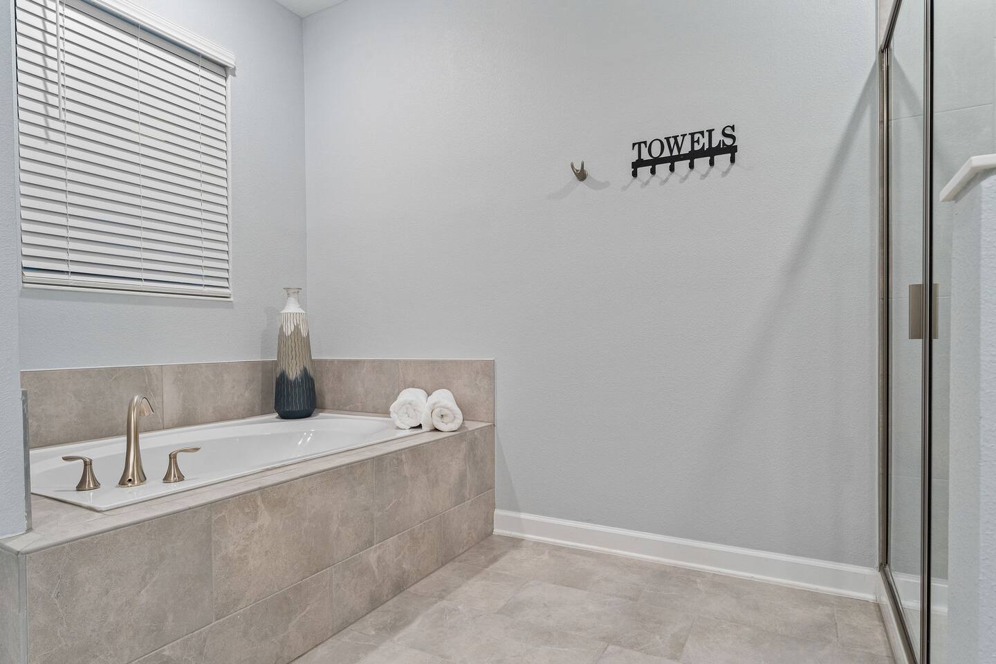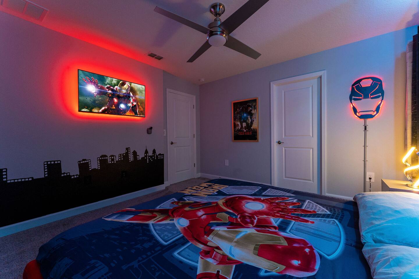 Miraculous Preserve Home: SIZE - 4300 sq ft - Parking on property NINE BEDROOMS - Bedroom 1: 50's/Mid Century Themed Master Bedroom on first floor with King bed, large screen smart tv and private full bathroom with garden tub and separate shower with outside entrance to patio/pool. - Bedroom 2: Western Themed on first floor with King bed, Smart TV, and entrance to full bathroom - Bedroom 3: Tribute to Walt Disney Themed with King bed, Smart TV, and entrance to Jack and Jill full bathroom. - Bedroom 4: Mickey/Minnie Themed with King bed and Smart TV - Bedroom 5: Spaceship Themed with King bed, Smart TV, and entrance to Jack and Jill full bathroom. - Bedroom 6: Superhero Themed with King bed, Smart TV, and entrance to Jack and Jill full bathroom. - Bedroom 7: Beach Themed with King bed, Smart TV and entrance to Jack and Jill full bathroom. - Bedroom 8: Princess Themed with full size carriage bed, vanity, and tent, and Smart TV. - Bedroom 9: Cartoon Themed with two full size beds, Xbox, gaming chairs, and Smart TV BATHROOMS - Bath 1: Full Private Master Bath on lower level with outside entrance to patio/pool - Bath 2: Full Bath on lower level with shower with entrance from Bedroom and hall - Bath 3: Full Jack & Jill Bath on second level with shower - Bath 4: Full Jack & Jill Bath on second level with shower - Bath 5: Full Bath with tub/shower combination LIVING ROOM/KITCHEN - Open concept living/kitchen and dining on lower level with Smart TV and snack bar - Fully equipped kitchen and coffee station GAME ROOM - Two Commercial Arcade Racing Games that can be linked together (play for free) - PacMan Arcade Game - Galaga Arcade Game - Pet Patrol Arcade Game - 75 Inch Smart TV - X Box Series S - Foosball - Air Hockey Table - Game Table - Board Games MOVIE/LOFT AREA - Large screen Smart TV - Theater Reclining Seating OTHER INFO - High Speed Internet - Spectrum Cable OUTSIDE - South Facing Pool backing up to protected Preservation land - Outside Grill with grilling utensils - Private Screened in Pool and Hot Tub with child safety gate - Patio with dining and conversation area with ceiling fans STOREY LAKE COMMUNITY ACCESS - Resort style Pool - Lazy River - Water Park - Spa - Exercise Gym - Basketball, Volleyball, Tennis Courts DISTANCE TO OTHER ATTRACTIONS: - About 6 miles from Disney Entrance without having to get on the busy expressway. - About 13 miles to Universal - About 9 miles from SeaWorld.