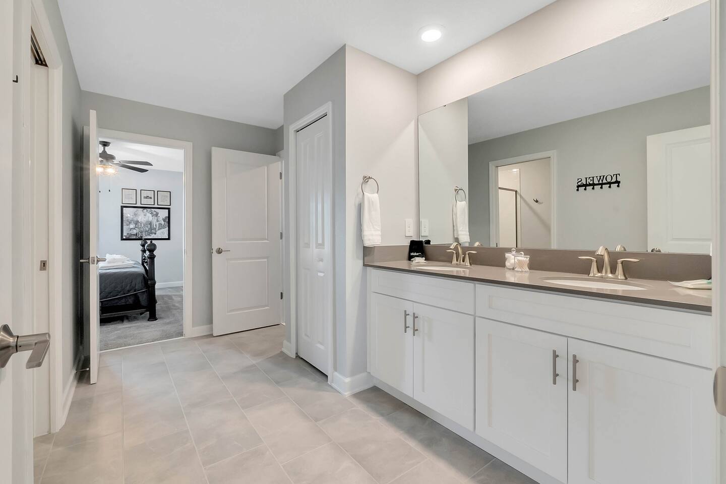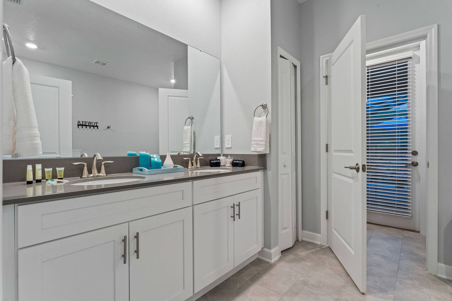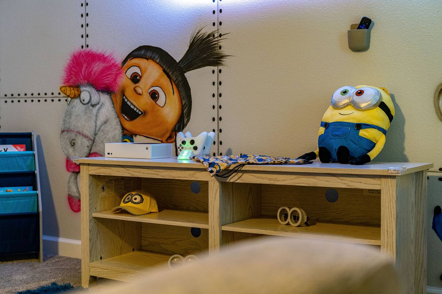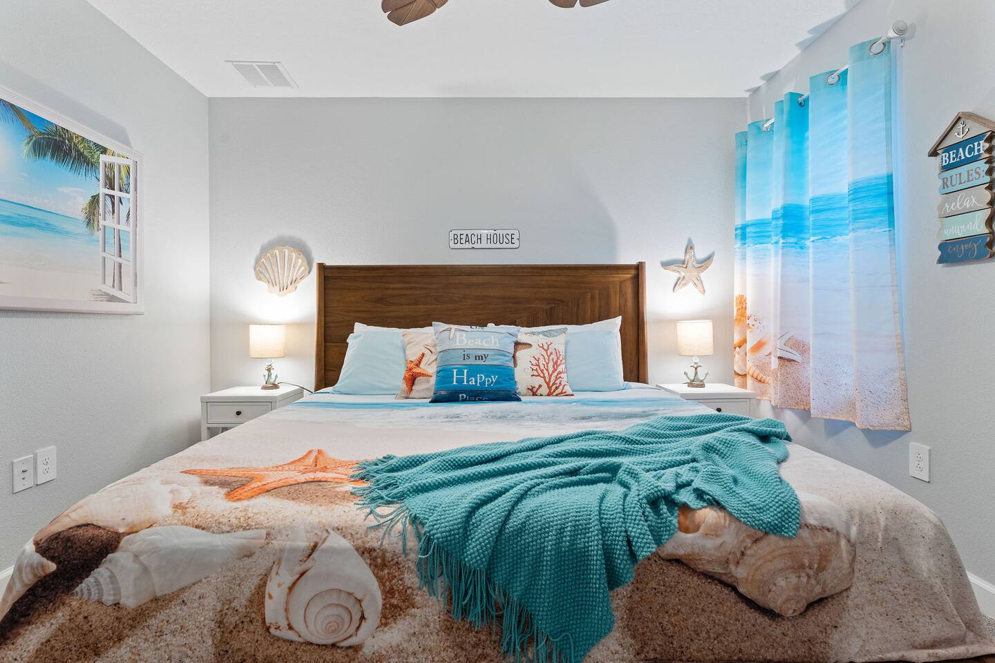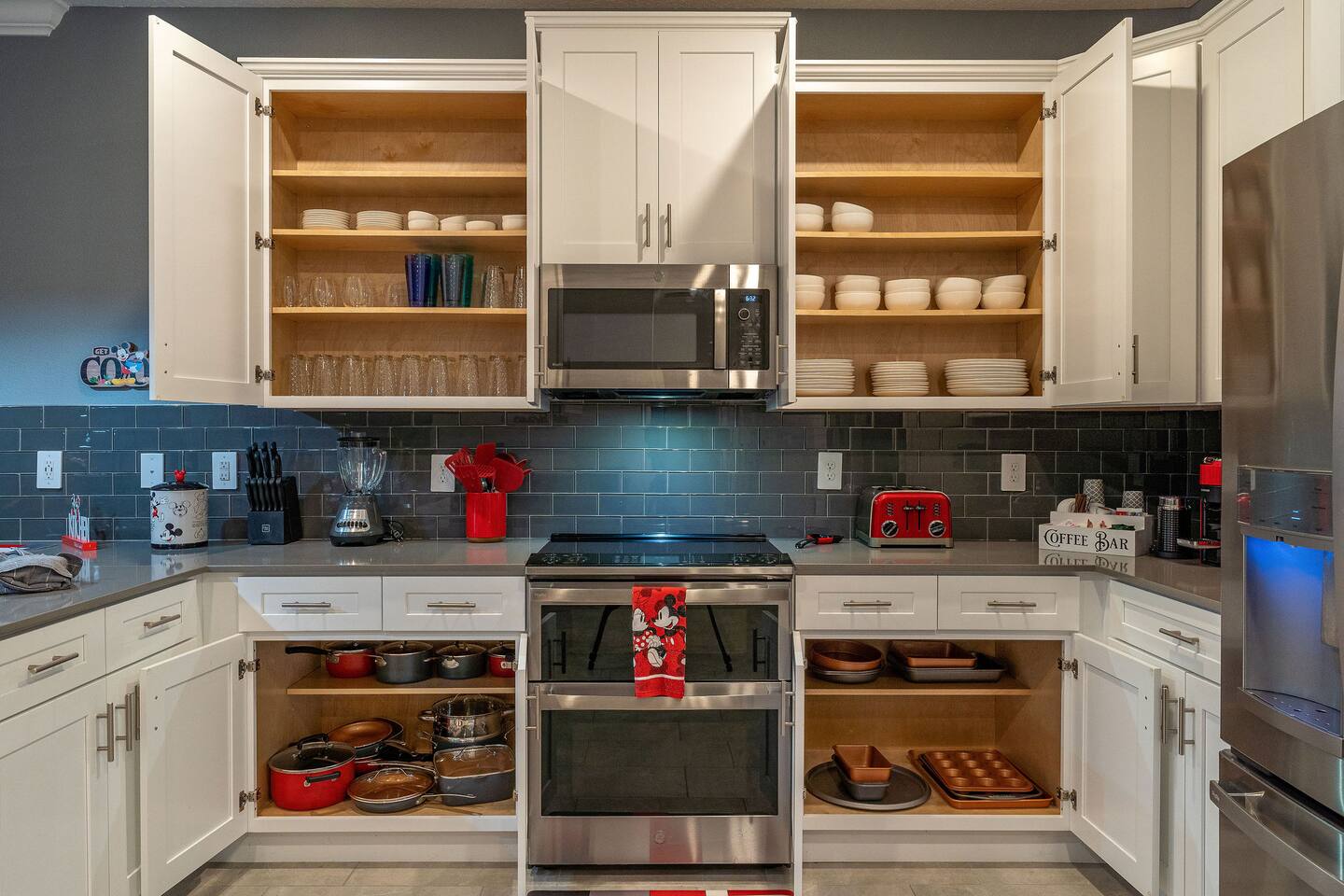 Miraculous Preserve Home: SIZE - 4300 sq ft - Parking on property NINE BEDROOMS - Bedroom 1: 50's/Mid Century Themed Master Bedroom on first floor with King bed, large screen smart tv and private full bathroom with garden tub and separate shower with outside entrance to patio/pool. - Bedroom 2: Western Themed on first floor with King bed, Smart TV, and entrance to full bathroom - Bedroom 3: Tribute to Walt Disney Themed with King bed, Smart TV, and entrance to Jack and Jill full bathroom. - Bedroom 4: Mickey/Minnie Themed with King bed and Smart TV - Bedroom 5: Spaceship Themed with King bed, Smart TV, and entrance to Jack and Jill full bathroom. - Bedroom 6: Superhero Themed with King bed, Smart TV, and entrance to Jack and Jill full bathroom. - Bedroom 7: Beach Themed with King bed, Smart TV and entrance to Jack and Jill full bathroom. - Bedroom 8: Princess Themed with full size carriage bed, vanity, and tent, and Smart TV. - Bedroom 9: Cartoon Themed with two full size beds, Xbox, gaming chairs, and Smart TV BATHROOMS - Bath 1: Full Private Master Bath on lower level with outside entrance to patio/pool - Bath 2: Full Bath on lower level with shower with entrance from Bedroom and hall - Bath 3: Full Jack & Jill Bath on second level with shower - Bath 4: Full Jack & Jill Bath on second level with shower - Bath 5: Full Bath with tub/shower combination LIVING ROOM/KITCHEN - Open concept living/kitchen and dining on lower level with Smart TV and snack bar - Fully equipped kitchen and coffee station GAME ROOM - Two Commercial Arcade Racing Games that can be linked together (play for free) - PacMan Arcade Game - Galaga Arcade Game - Pet Patrol Arcade Game - 75 Inch Smart TV - X Box Series S - Foosball - Air Hockey Table - Game Table - Board Games MOVIE/LOFT AREA - Large screen Smart TV - Theater Reclining Seating OTHER INFO - High Speed Internet - Spectrum Cable OUTSIDE - South Facing Pool backing up to protected Preservation land - Outside Grill with grilling utensils - Private Screened in Pool and Hot Tub with child safety gate - Patio with dining and conversation area with ceiling fans STOREY LAKE COMMUNITY ACCESS - Resort style Pool - Lazy River - Water Park - Spa - Exercise Gym - Basketball, Volleyball, Tennis Courts DISTANCE TO OTHER ATTRACTIONS: - About 6 miles from Disney Entrance without having to get on the busy expressway. - About 13 miles to Universal - About 9 miles from SeaWorld.