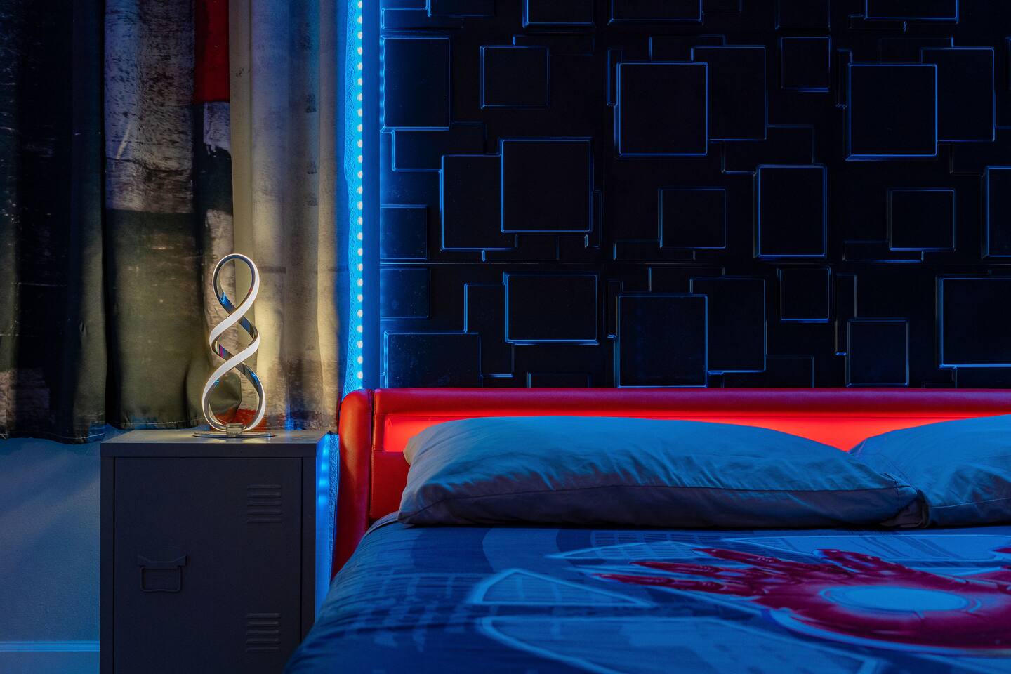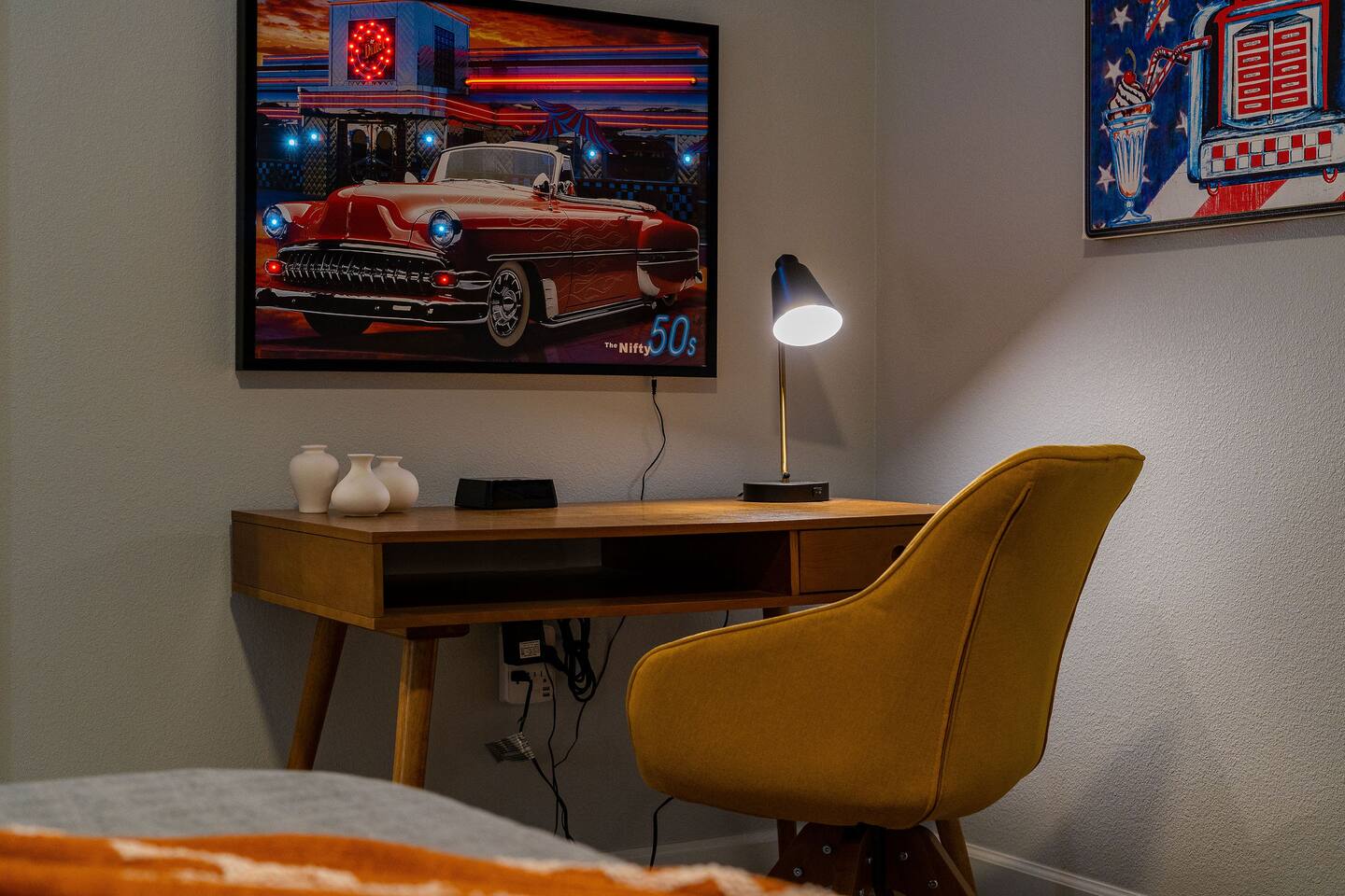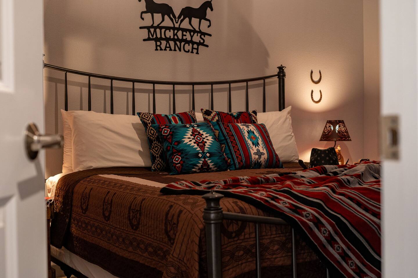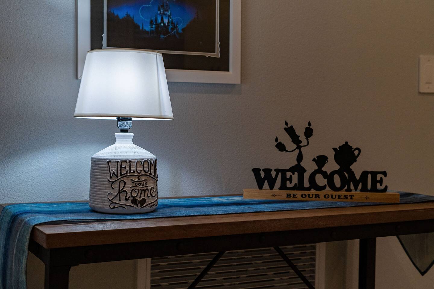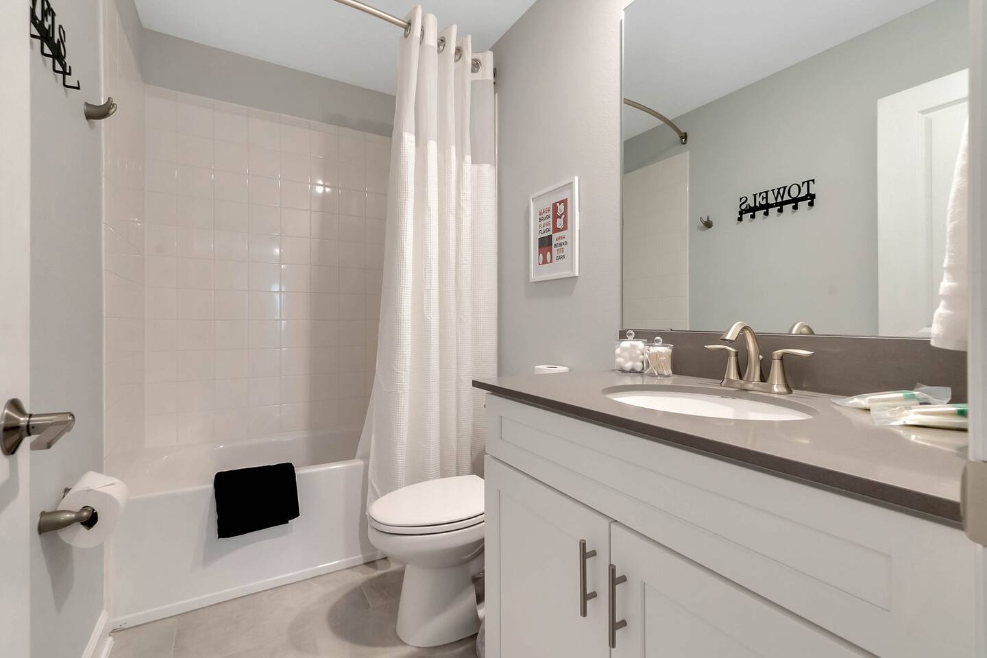 Miraculous Preserve Home: SIZE - 4300 sq ft - Parking on property NINE BEDROOMS - Bedroom 1: 50's/Mid Century Themed Master Bedroom on first floor with King bed, large screen smart tv and private full bathroom with garden tub and separate shower with outside entrance to patio/pool. - Bedroom 2: Western Themed on first floor with King bed, Smart TV, and entrance to full bathroom - Bedroom 3: Tribute to Walt Disney Themed with King bed, Smart TV, and entrance to Jack and Jill full bathroom. - Bedroom 4: Mickey/Minnie Themed with King bed and Smart TV - Bedroom 5: Spaceship Themed with King bed, Smart TV, and entrance to Jack and Jill full bathroom. - Bedroom 6: Superhero Themed with King bed, Smart TV, and entrance to Jack and Jill full bathroom. - Bedroom 7: Beach Themed with King bed, Smart TV and entrance to Jack and Jill full bathroom. - Bedroom 8: Princess Themed with full size carriage bed, vanity, and tent, and Smart TV. - Bedroom 9: Cartoon Themed with two full size beds, Xbox, gaming chairs, and Smart TV BATHROOMS - Bath 1: Full Private Master Bath on lower level with outside entrance to patio/pool - Bath 2: Full Bath on lower level with shower with entrance from Bedroom and hall - Bath 3: Full Jack & Jill Bath on second level with shower - Bath 4: Full Jack & Jill Bath on second level with shower - Bath 5: Full Bath with tub/shower combination LIVING ROOM/KITCHEN - Open concept living/kitchen and dining on lower level with Smart TV and snack bar - Fully equipped kitchen and coffee station GAME ROOM - Two Commercial Arcade Racing Games that can be linked together (play for free) - PacMan Arcade Game - Galaga Arcade Game - Pet Patrol Arcade Game - 75 Inch Smart TV - X Box Series S - Foosball - Air Hockey Table - Game Table - Board Games MOVIE/LOFT AREA - Large screen Smart TV - Theater Reclining Seating OTHER INFO - High Speed Internet - Spectrum Cable OUTSIDE - South Facing Pool backing up to protected Preservation land - Outside Grill with grilling utensils - Private Screened in Pool and Hot Tub with child safety gate - Patio with dining and conversation area with ceiling fans STOREY LAKE COMMUNITY ACCESS - Resort style Pool - Lazy River - Water Park - Spa - Exercise Gym - Basketball, Volleyball, Tennis Courts DISTANCE TO OTHER ATTRACTIONS: - About 6 miles from Disney Entrance without having to get on the busy expressway. - About 13 miles to Universal - About 9 miles from SeaWorld.